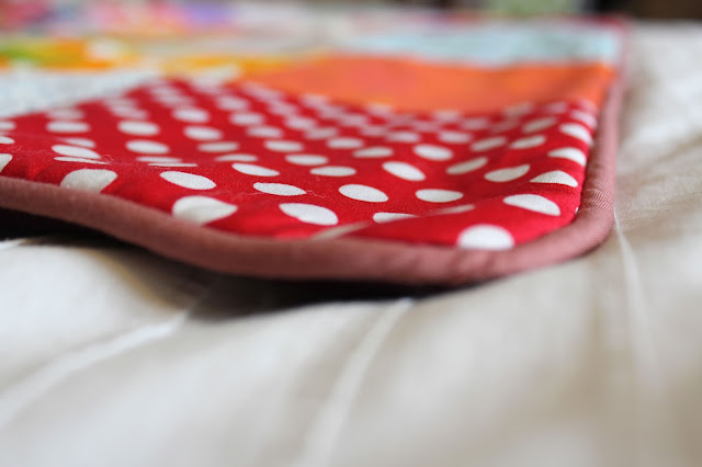 J’ai doublé la couverture d’un molleton en bambou et d’une toile de coton épaisse pour pouvoir la mettre dehors pour la sieste. Juste un passepoil cendre de rose pour souligner le tout et hop le tour est joué.