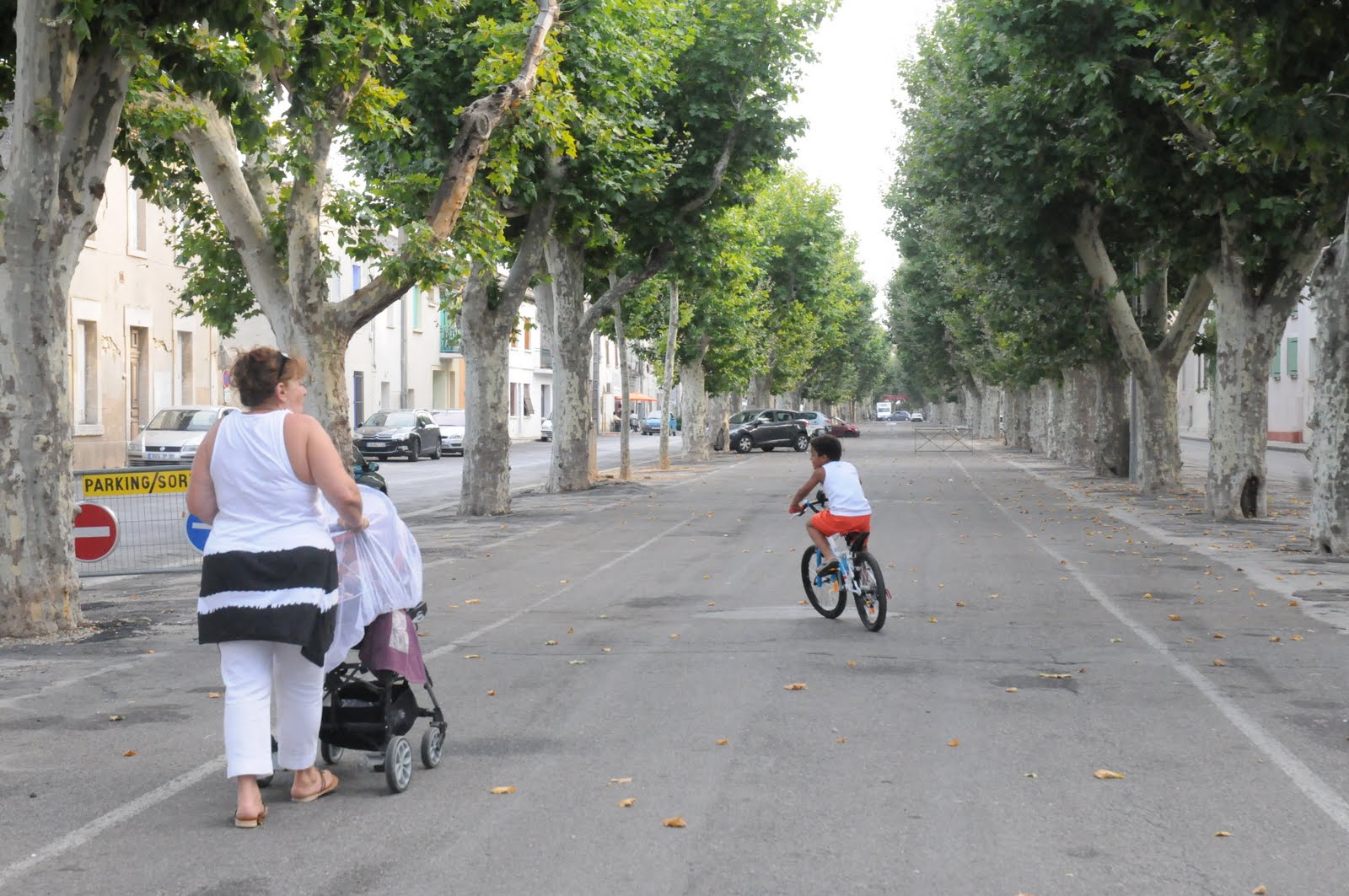 Après le dîner, on fait parfois un tour de poussette et de vélo, c’est l’occase pour Sacha de pédaler à fond entre les platanes, ça lui fait du bien au petit parisien d’avoir de l’espace!