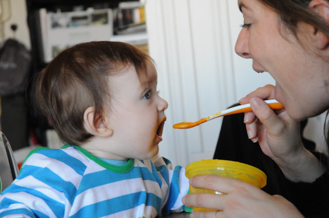 12:00 chaque jour un peu plus, Violette se régale de manger à la cuillère, faut tenir la cadence parce que elle enfourne la jolie, pas question de faire l’avion… bien utile le bavoir à bras, HEMA je t’aime tu sais?