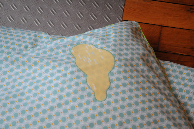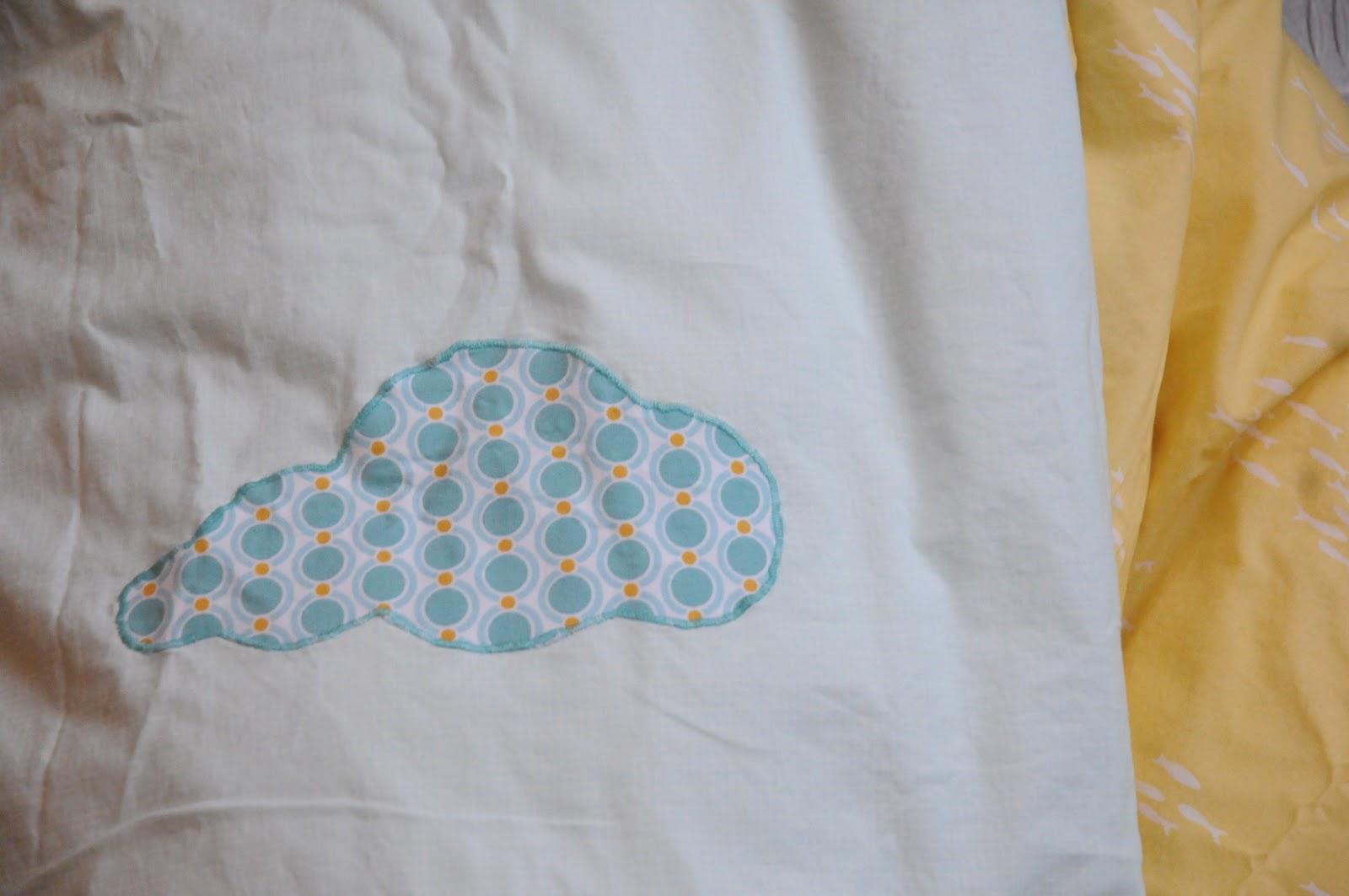 J’en avais un peu mare des housses de couettes Ikéa, et j’ai eu envie de me lancer dans la pose de passepoil, alors hop hop hop, une couette toute douce et une taie d’oreiller pour Sacha. Les nuages ont été très faciles à poser grâce au Vliesofix, genre de thermocollant double face, du coup l’appliqué en zigzag est très simple à réaliser!