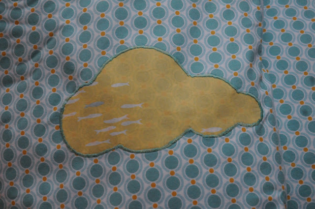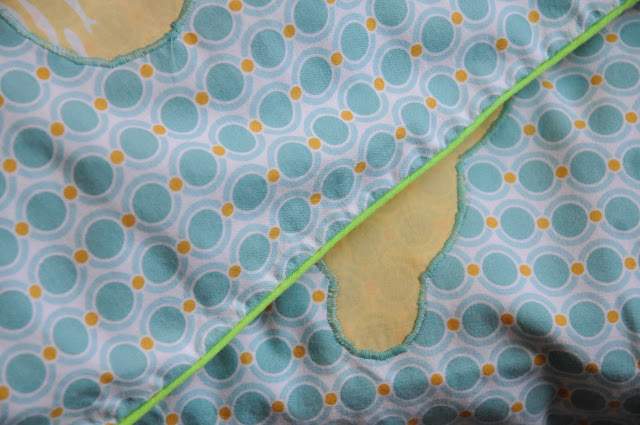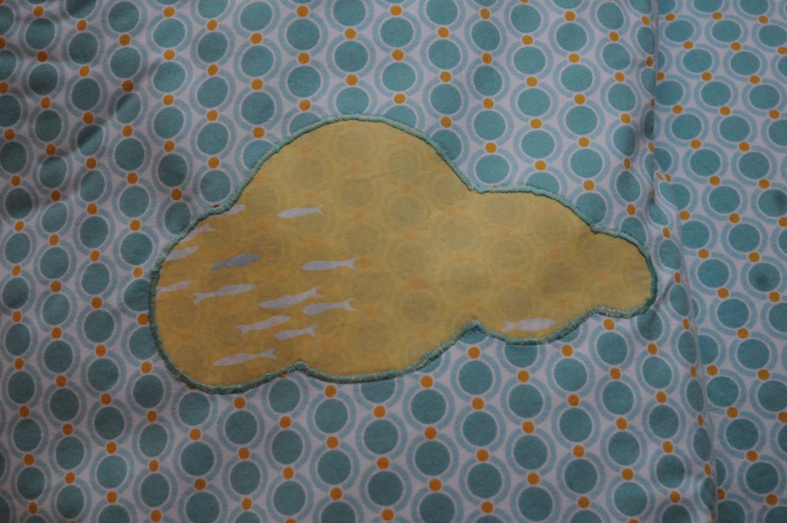 *** Tissu rétro bleu et moutarde, tissu ciel quadrillé et tissus jaune pâle banc de poissons en coton bio, le tout chez Lil Weasel. Passepoil vert fluo chez fil 2000. ***