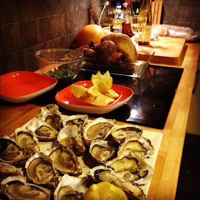 On s’ouvre une bonne bouteille de Sylvaner en ouvrant les huîtres. Le vin a une drôle de couleur, c’est de la piquette. de 2001 quand même. (j’aurais dû y voir un signe).