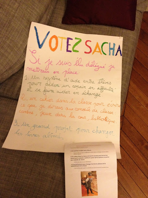 Je rentre un soir épuisée par ma journée de travail, et Sacha guilleret comme jamais me lance, « maman, je veux me présenter comme délégué de classe, il faut faire un programme pour demain. »