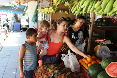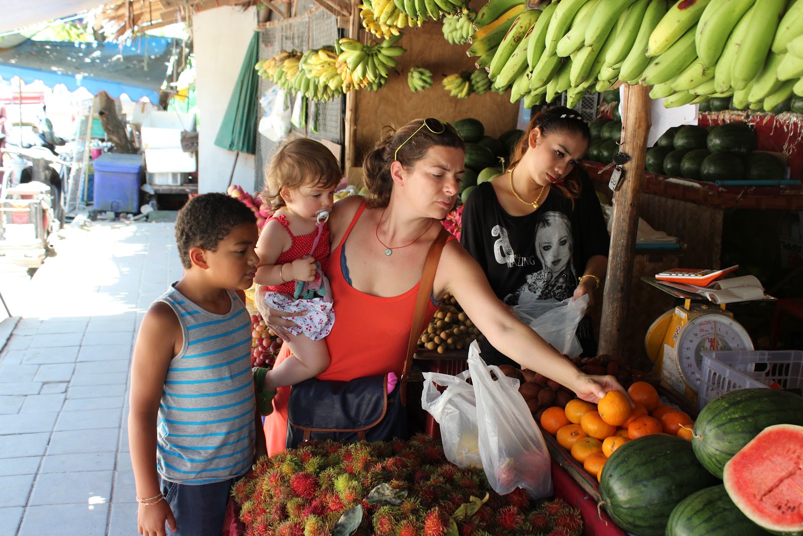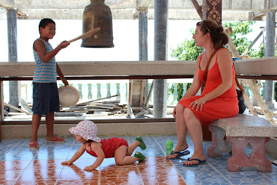 Voyager longtemps * Arriver complètement déphasés * Dormir tous les quatre un gros coup * Profiter de la piscine, des bulles, des cascades * S’hydrater à grands renforts d’eau minérale et de Singha Bier * Aller faire des courses, ne rien comprendre aux produits * Découvrir un marché * Retrouver le Big Boudha * Réaliser que cette fois ci Violette le voit en vrai * Se baigner encore et encore * Commander des glaces et des fruits frais * Courir sur la plage après Sacha et lui jeter du sable * Se dire: on est là, et halluciner un peu * Blogger à la fraiche, les pieds (presque) dans l’eau *