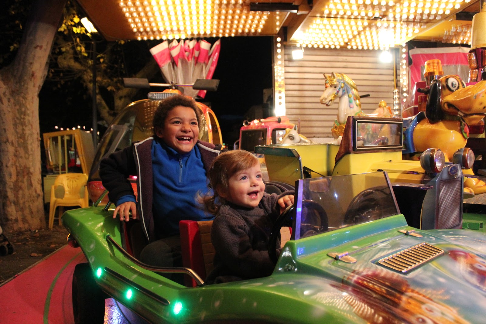 Premier tour de manège pour Violette… Hystérie totale ! on a cru une seconde qu’elle ne resterait pas en place, mais quenéni, la violette a vite pigé le truc ! le Cha a été patient, les genoux au niveau du menton, beaucoup trop grand pour la petite voiture !