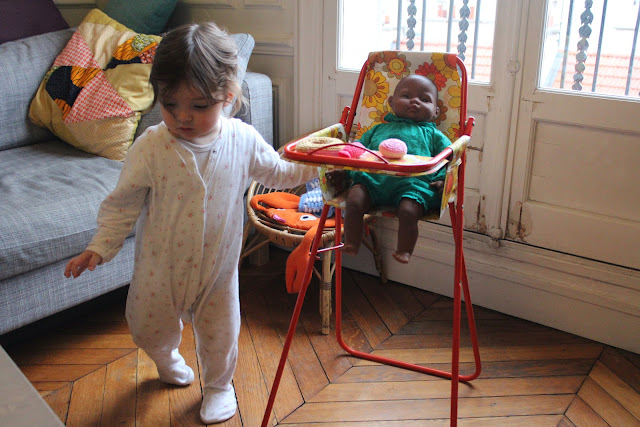 depuis ce matin, Violette jolie joue avec la chaise haute de son poupon. Elle lui file que des cochonneries à manger, ça n’a pas l’air de perturber le bébé !