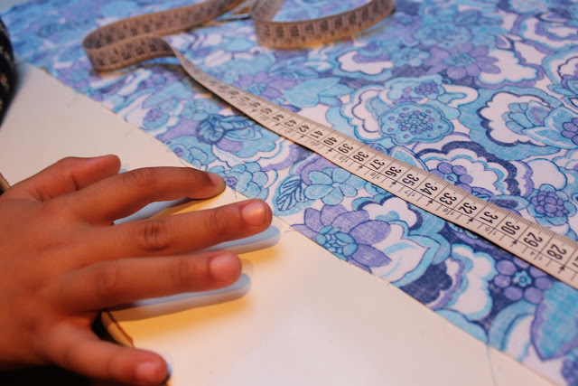 Il a commencé par choisir ses tissus, un tissu vintage bleu à fleur et un coordonné à pois.