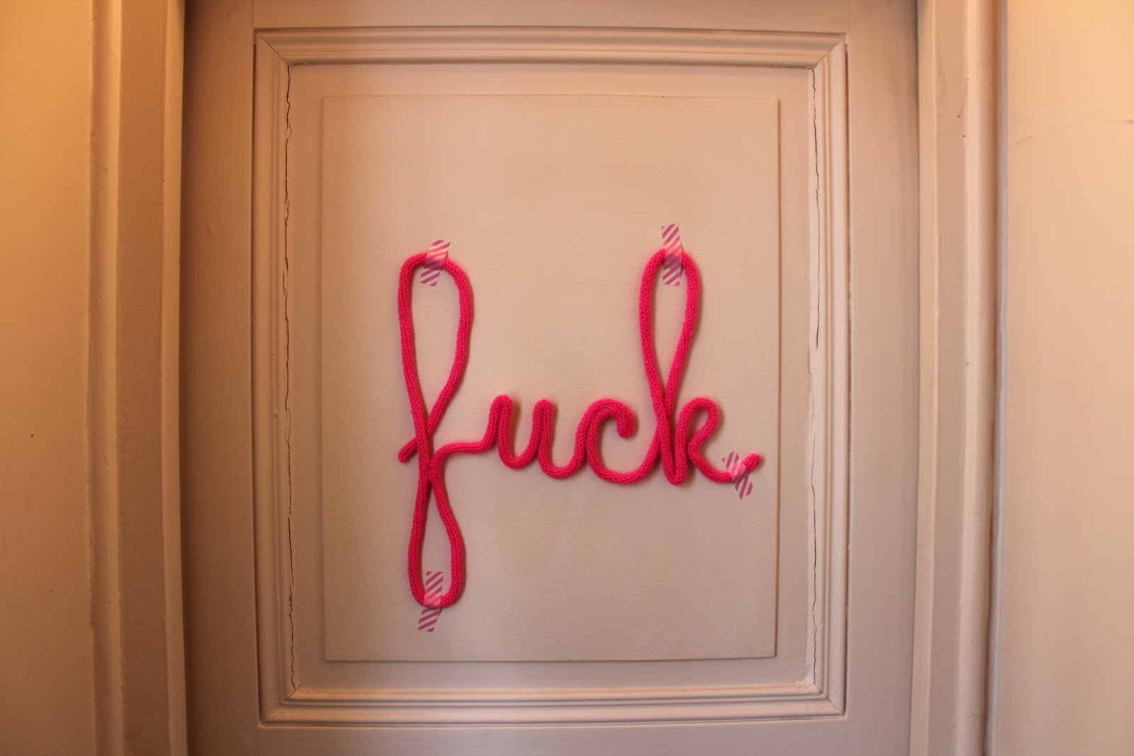 Sacha m’a demandé si j’étais sérieuse de mettre ça sur une porte. Je lui ai répondu qu’un gros mot en laine accroché sur la porte de nos toilettes n’avait pas le même sens, ni le même impact qu’un gros mot balancé avec colère ou agressivité dans la rue. Je lui expliqué que dans l’intimité d’une petite pièce c’était du second degrés, une provocation, de l’humour.