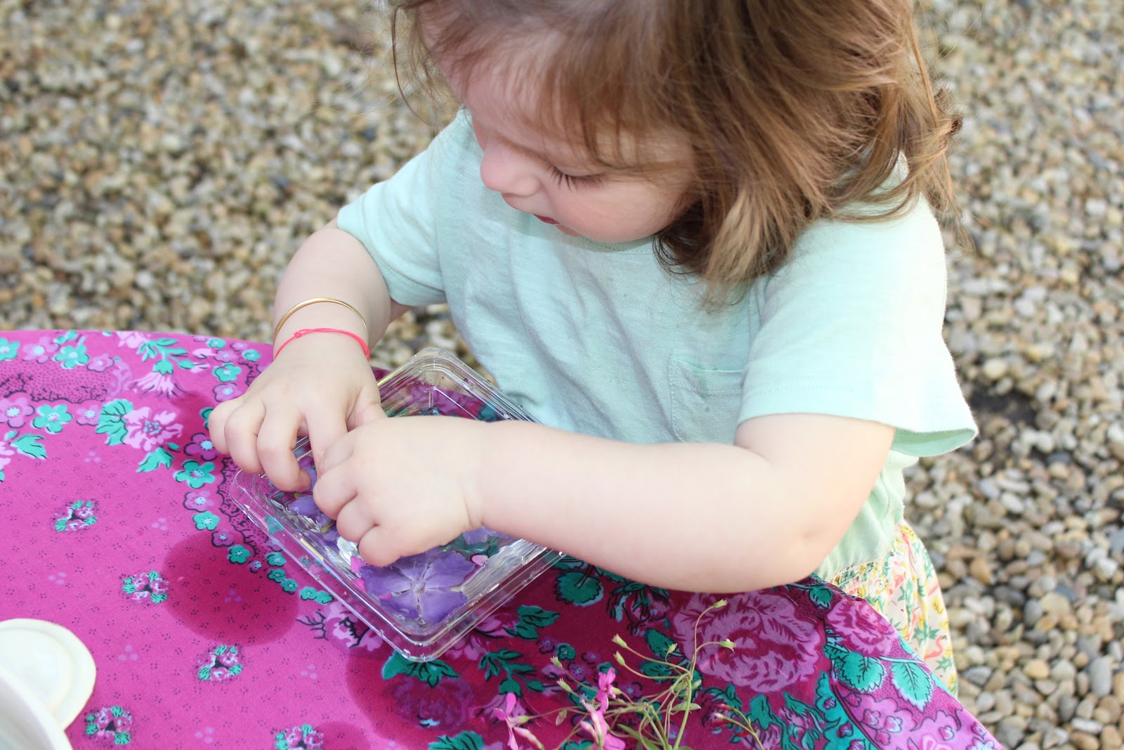 Pour le bouquet flottant de Violette, j’ai choisi de lui donner une coupelle et un verre en plastique plus pratique et plus léger pour elle. Elle s’est amusée à verser l’eau et à arranger ses petites fleurs… Elle a joué comme ça pendant vingt minutes!