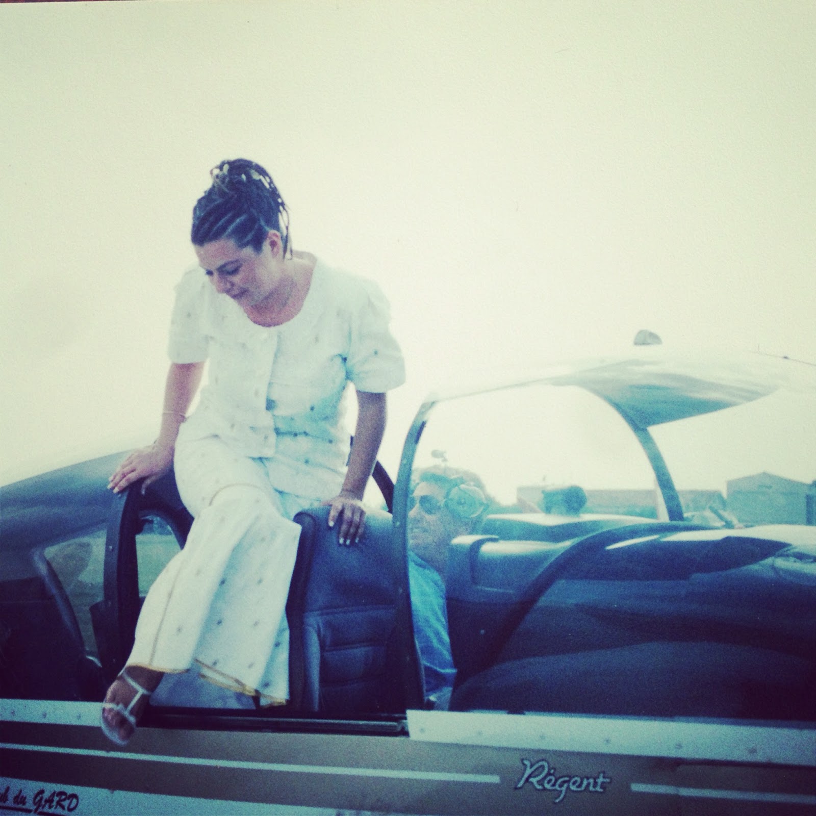 Ils m’ont offert un survol du Pont du Gard. Dans le coucou il y avait, le pilote, papou et moi! Je te dis pas comme j’étais contente! Lorsque nous avons atterri, tout les invités nous attendaient sur le tarmac. Pour ton papa ça a été une grande surprise de me voir arriver en avion,il découvrait aussi ma tenue de mariée!