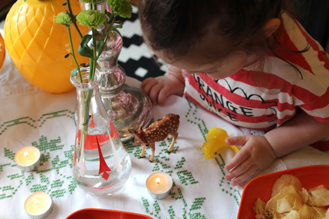 Violette a adoré manger sur la table basse, elle a picoré, tout touché du bout des doigts. Le concept du dîner aux chandelles lui échappe un peu je crois, elle pensait que c’était son anniversaire!