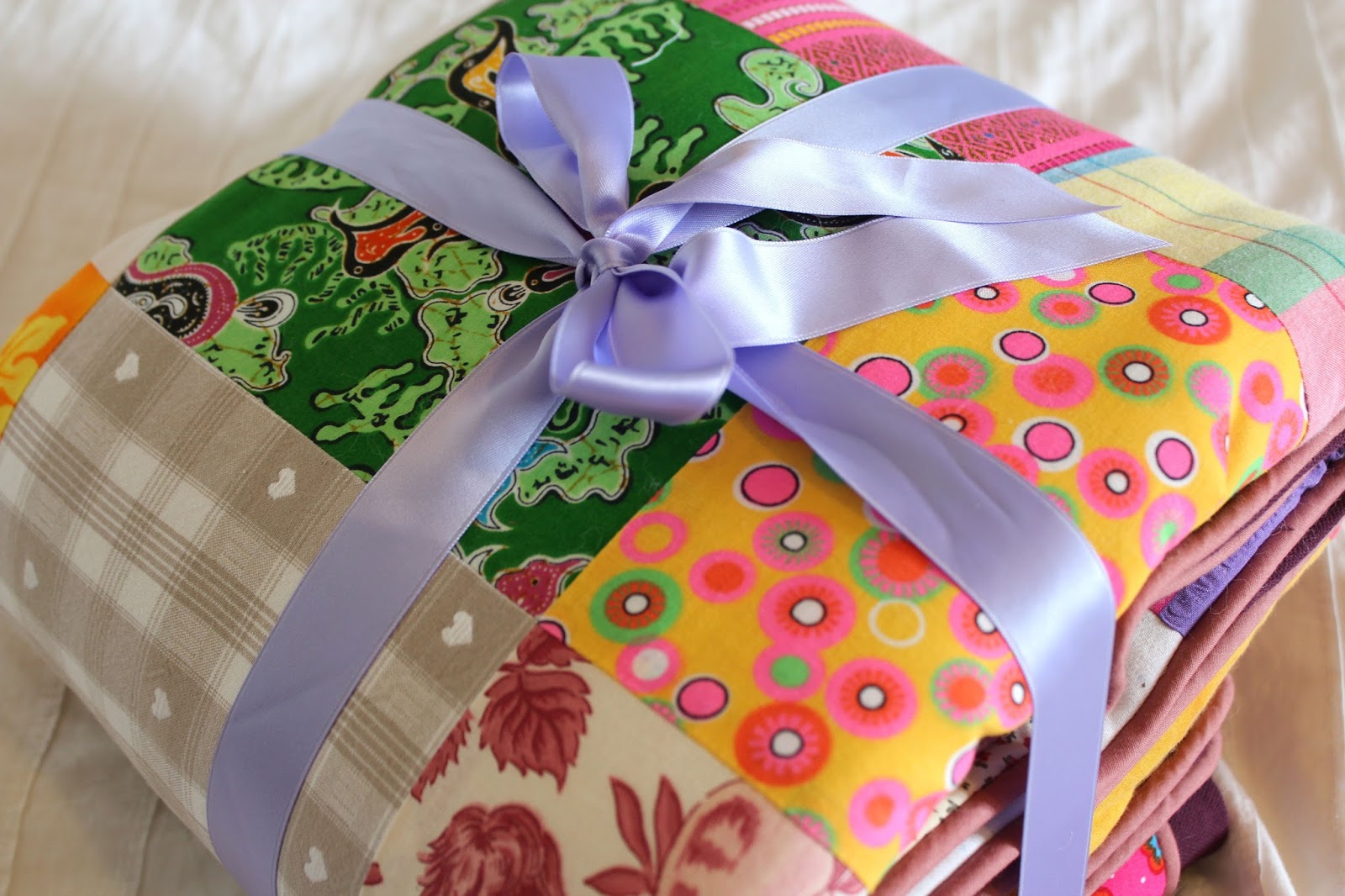 Nous avons reçu des enveloppes pleines de tissus et de mots doux tout au long de ces deux années, de nos familles, de nos amis, mais aussi de beaucoup d’inconnues avec qui j’ai fait des échanges. C’était génial de recevoir tout ça des quatre coins du monde. Tous les mots sont dans une boite, que je donnerai à Violette lorsqu’elle sera grande. Sur chacun d’eux, il y a un rappel du tissu que vous avez envoyé, ainsi nous savons exactement d’où provient chaque carré.