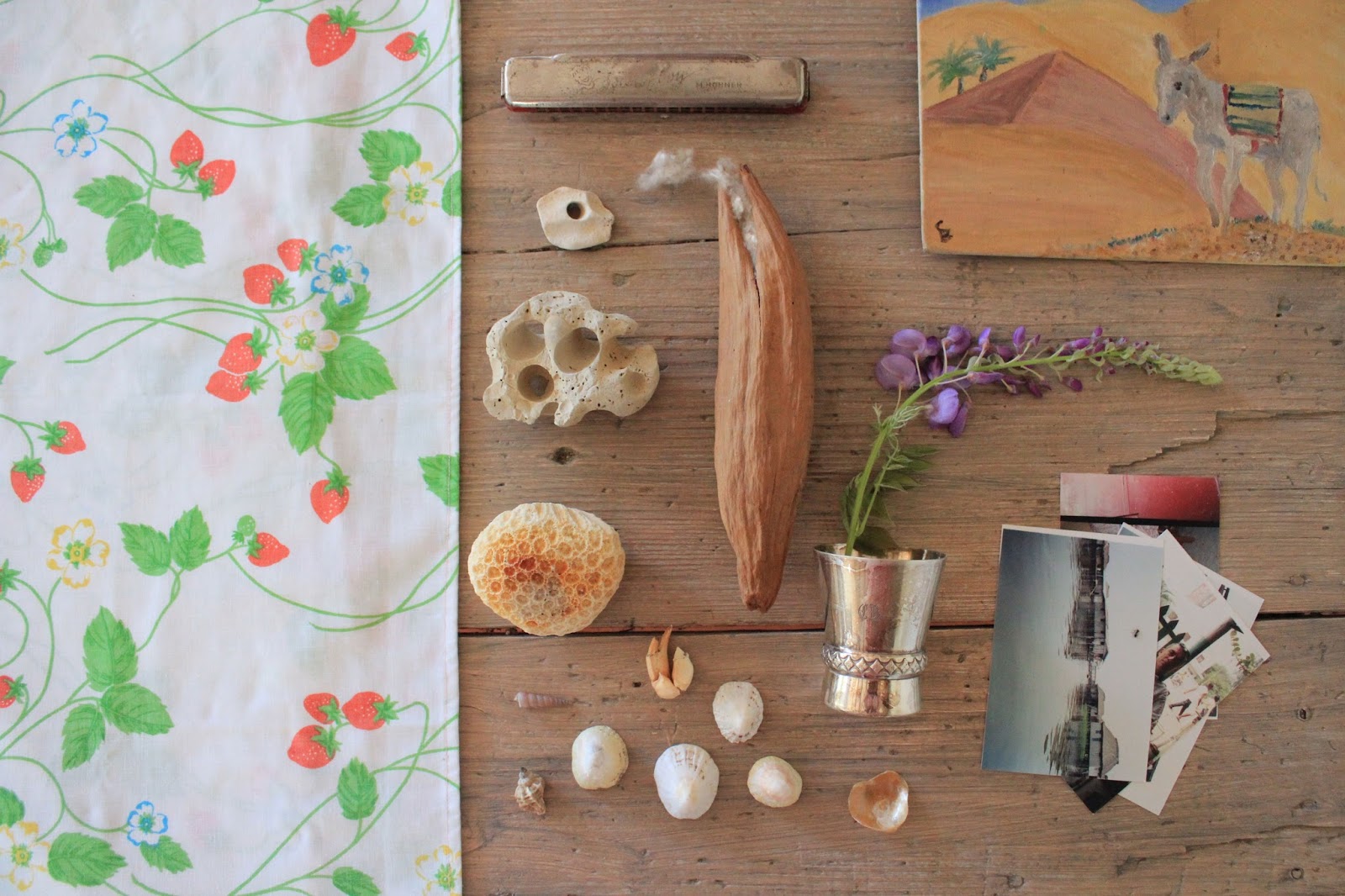 Cette nappe fraise que j’adorais. Je savais que quand elle était de sortie c’était la fête. L’harmonica de mon grand père, des années à essayer d’en faire sortir une mélodie. Un tableau que j’avais peint à l’huile lorsque j’étais petite. Le gobelet de ma naissance où flotte toujours une fleur. Les coquillages des pays que l’on a visités, ou simplement ceux de notre plage préférée à Oléron. le corail djiboutien de Korambado, la gousse de kapok de Porto Novo. Et puis toujours les photos qui trainent, juste sous la table basse, quelques albums, pour que l’on puisse feuilleter les bons moments n’importe quand.