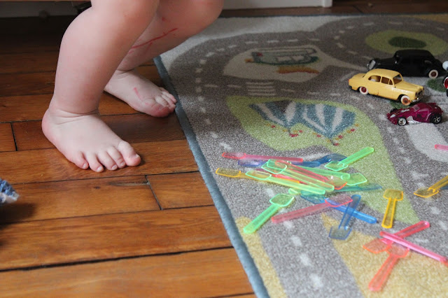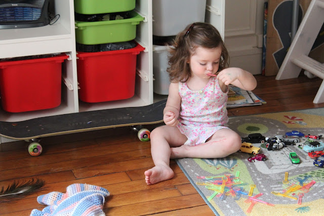 Elle était comme une petite folle, elle a colorié pas mal de cartons, en dépassant un peu sur elle, elle a tout sorti, tout aligné, elle a traqué le moindre légo pour le ranger à sa place… Et puis elle est tombée sur le nid de cartes pokémon en poussant des cris de joie!