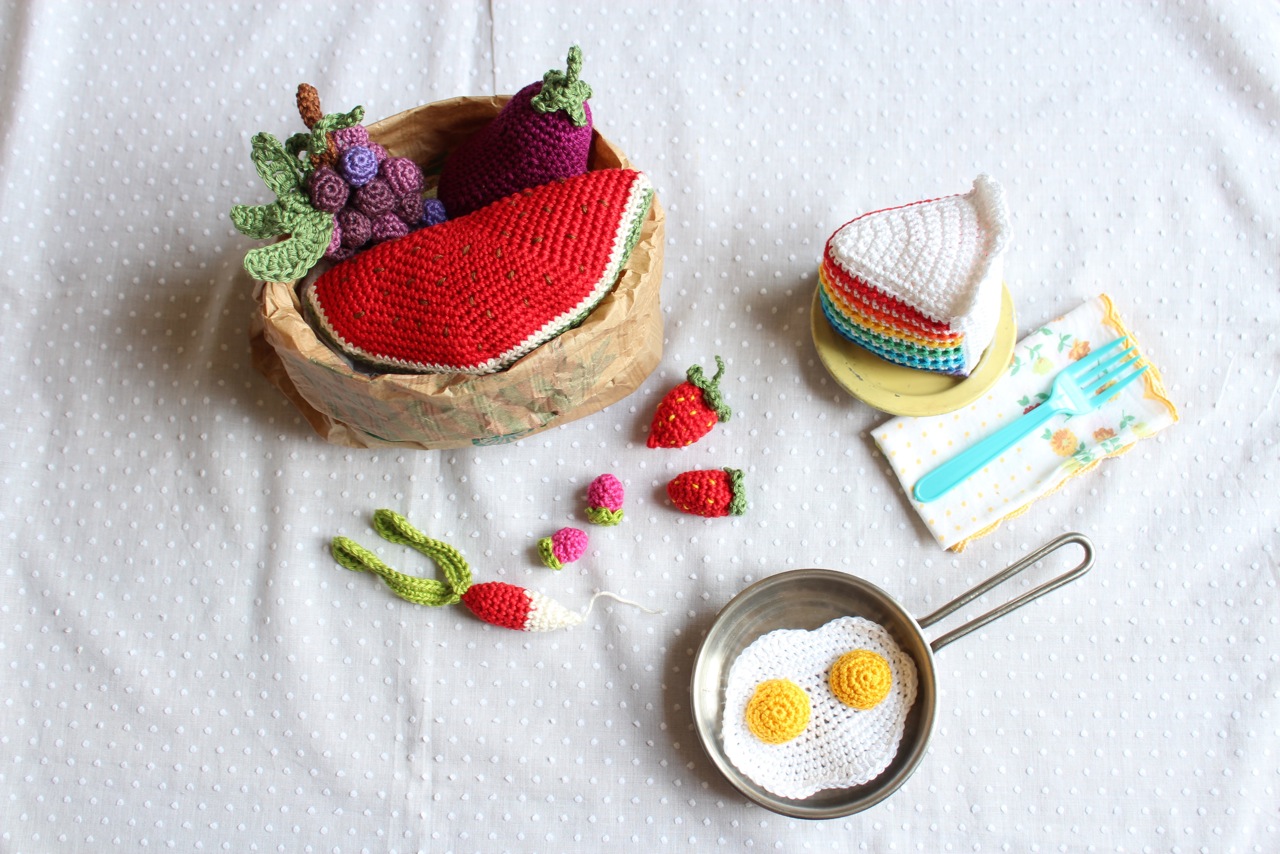 Cette dinette au crochet est magnifique! J’ai moi-même commencé à faire quelques fruits et légumes au crochet grâce à des tutos trouvés sur le net mais ce n’est pas aussi joli que ce que je vois sur les photos! Ces merveilles crochetés donnent envie de retourner jouer à la marchande!