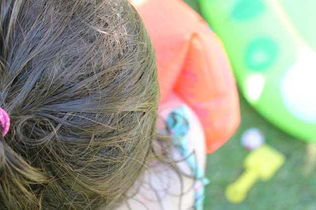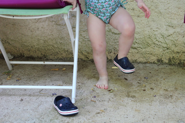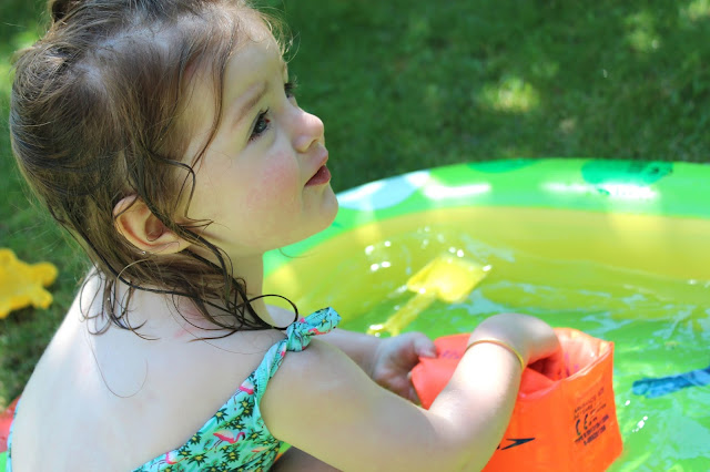 On profite de leur beau jardin et de la piscine. Tout doucement on a réussi à enfiler les brassards à Violette. Victoire.