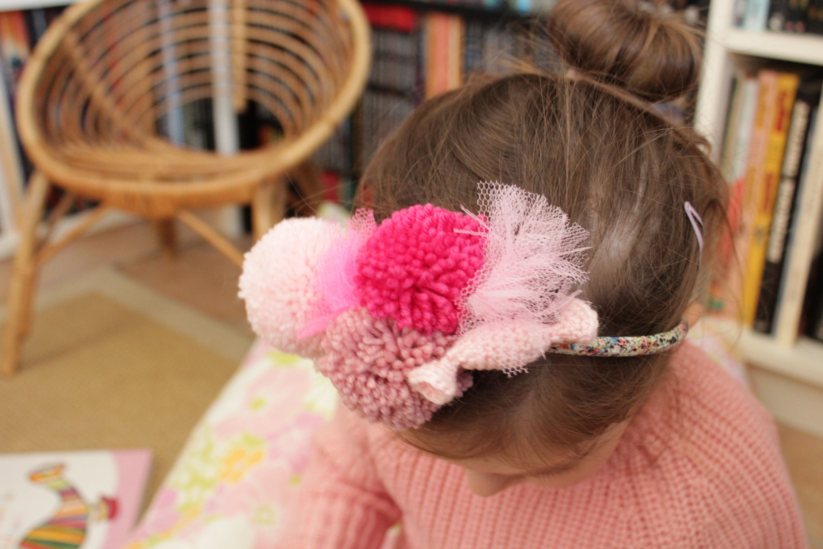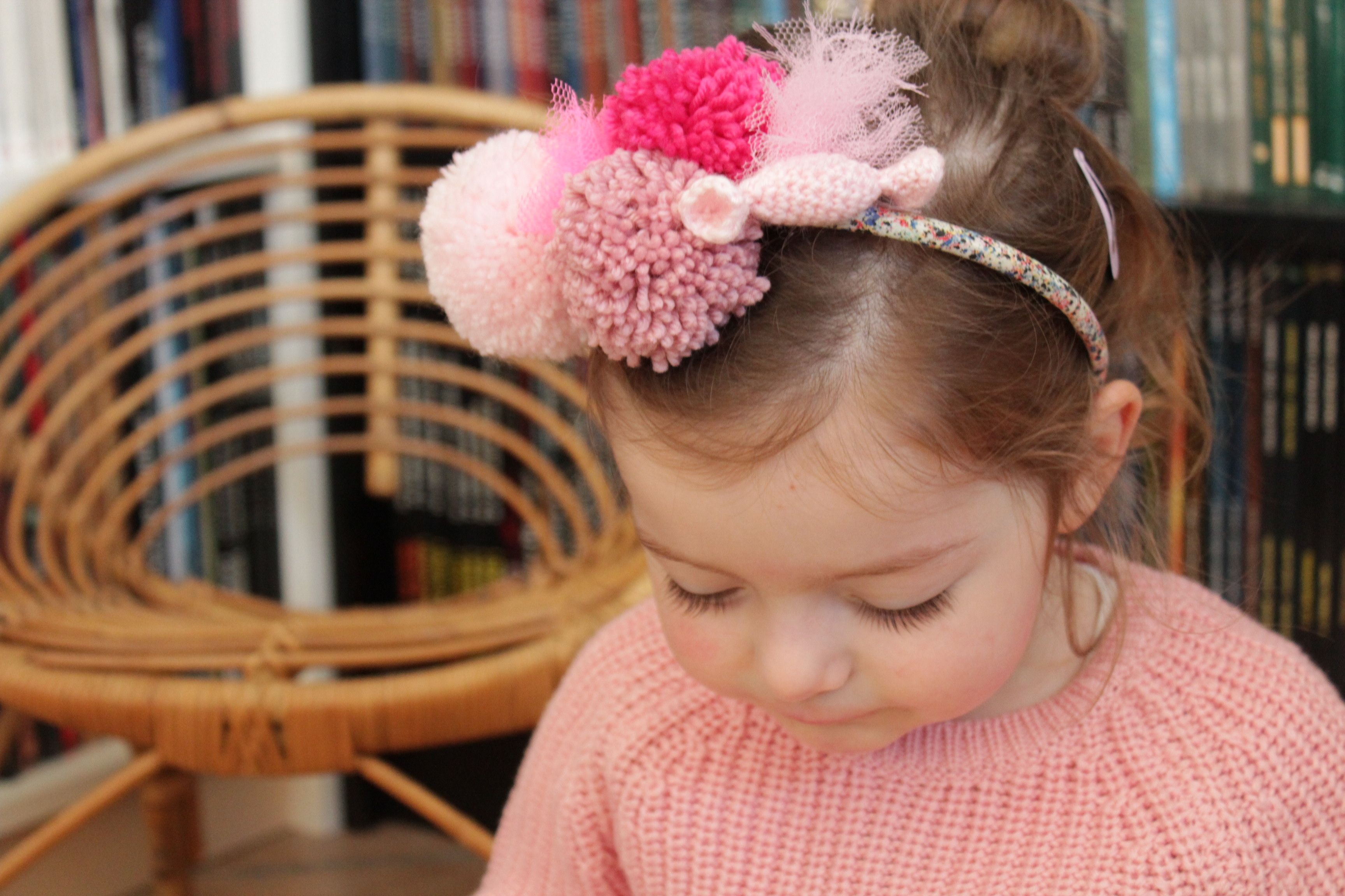 Quelques pompons, du tulle et un bonbon au crochet et voilà un serre tête pour petite fille espiègle!