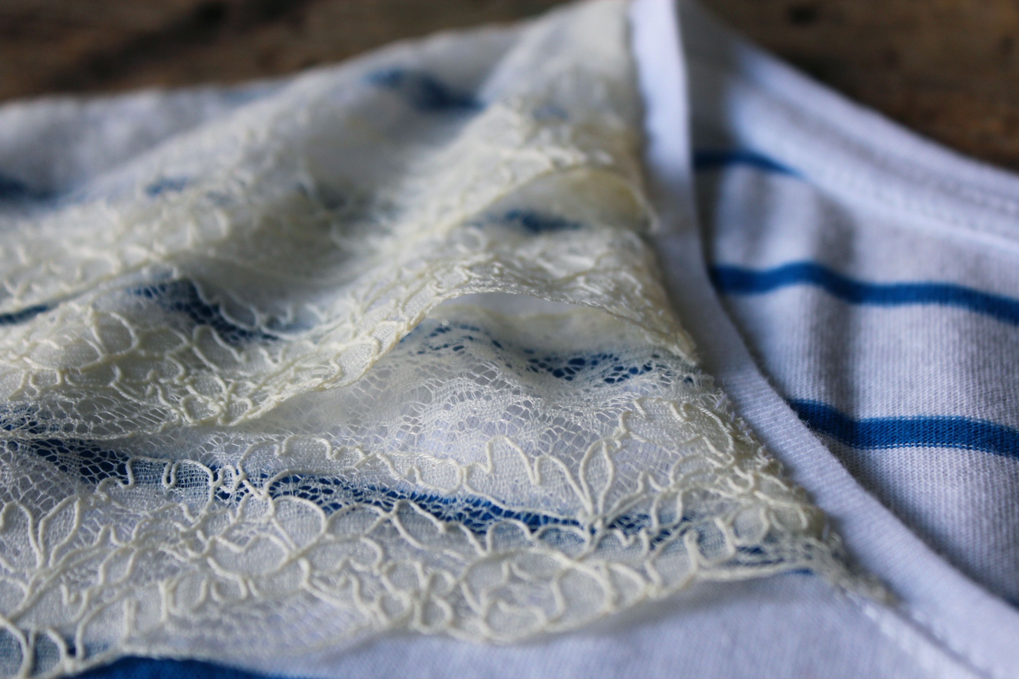 J’avais chinée il y a bien longtemps de la dentelle de Calais dans un monastère, je suis sûre que vous en trouverez sur des vide greniers pour pas cher. Si vous hésitez entre deux, choisissez une dentelle fine et aérienne, associée au jersey de la marinière, le rendu n’en sera que plus joli.