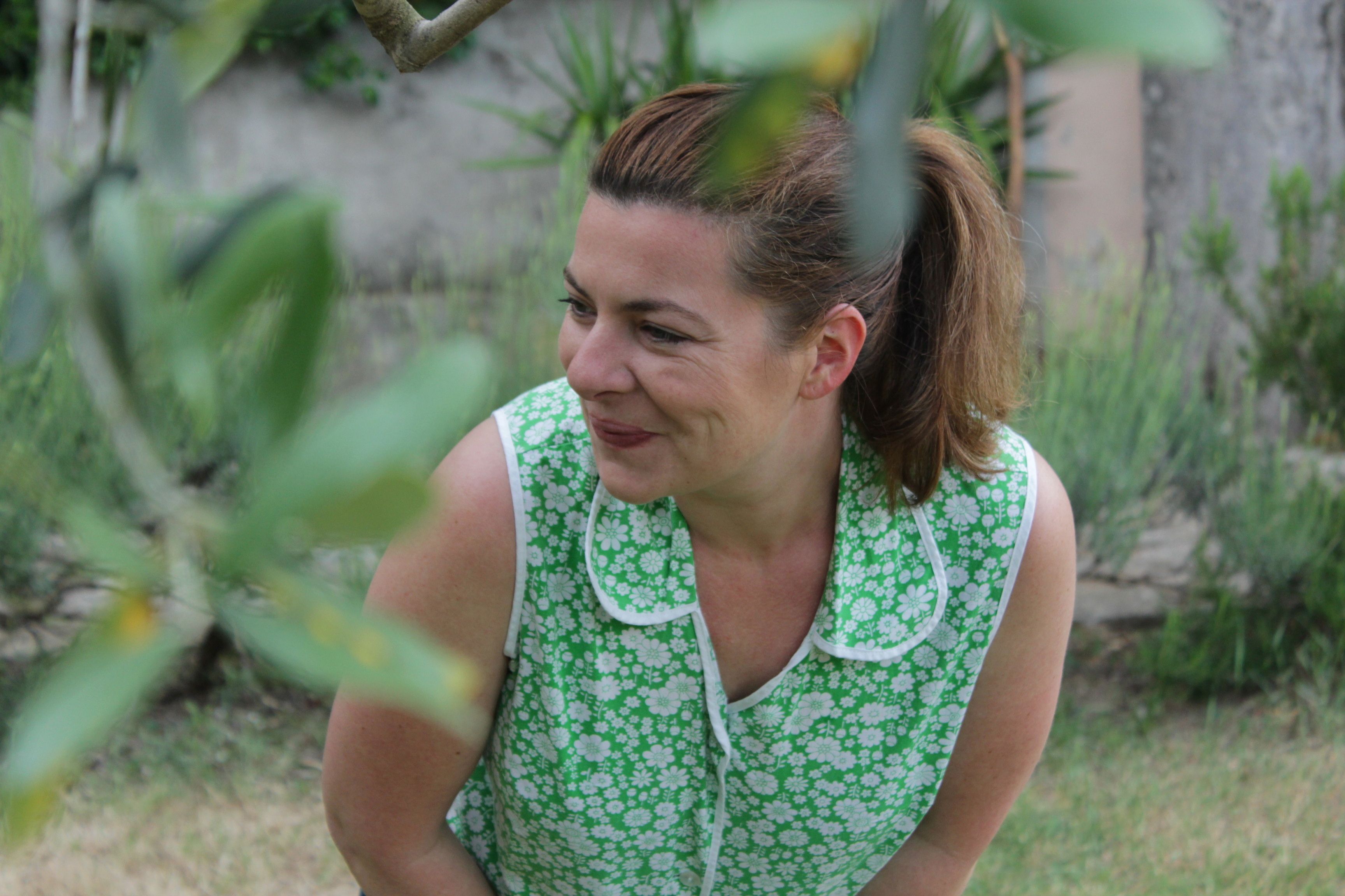 L’idée, je l’ai trouvée en chinant un dimanche avec Sacha. Je suis tombée amoureuse des motifs de loin. j’ai tiré la manche du Cha en lui disant « Là bas! j’ai vu du vert comme j’aime » . Je suis tombée sur une vieille blouse de ménage en taille 48.