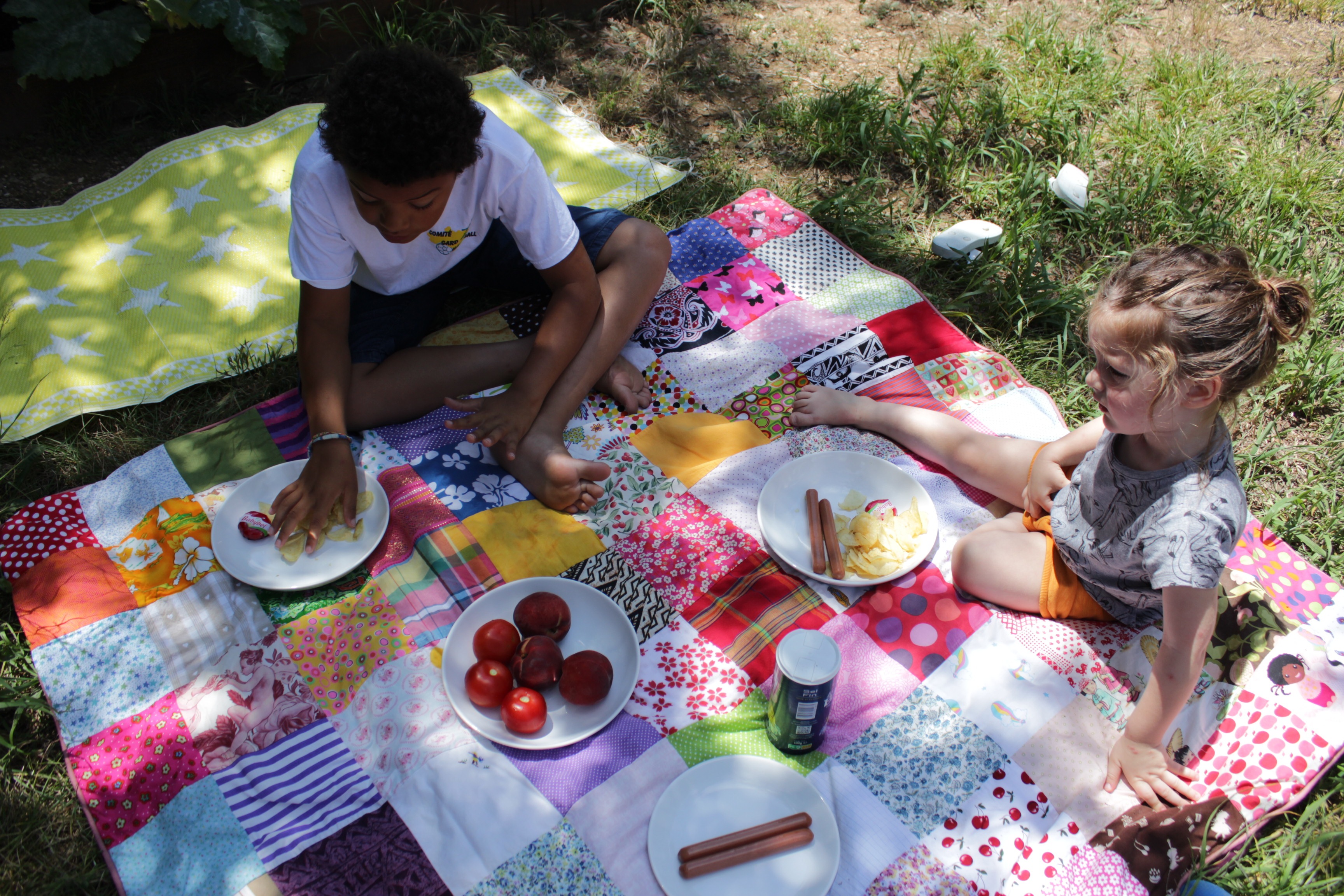 Pour sécher les larmes et la deception, j’ai étendu le BJB de Violette, ouvert des chips et nous avons déjeuné dehors. J’ai montré aux enfants comment manger une tomate croque au sel, en se moquant du jus qui dégouline et des pépins qui giclent sur tout le monde.