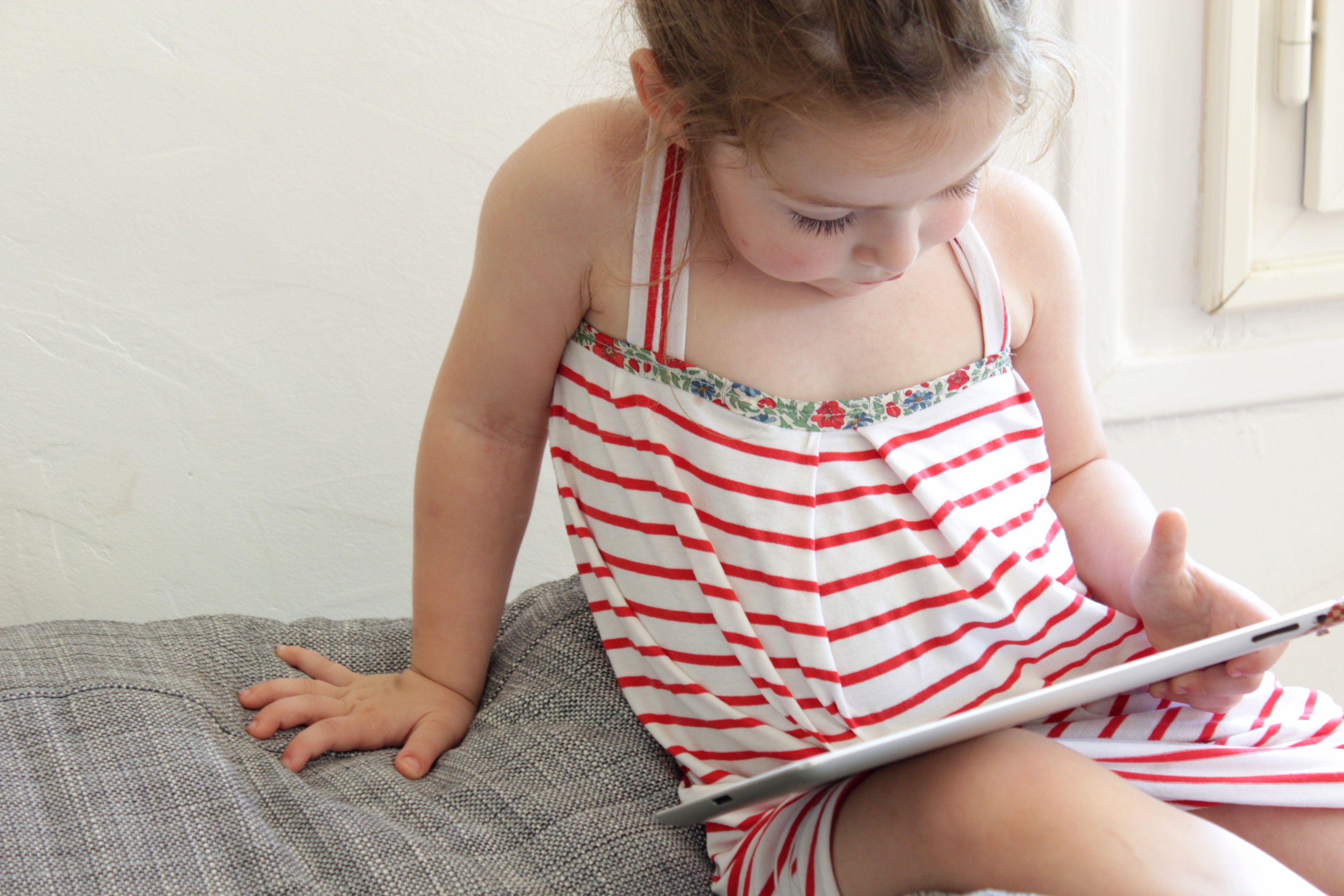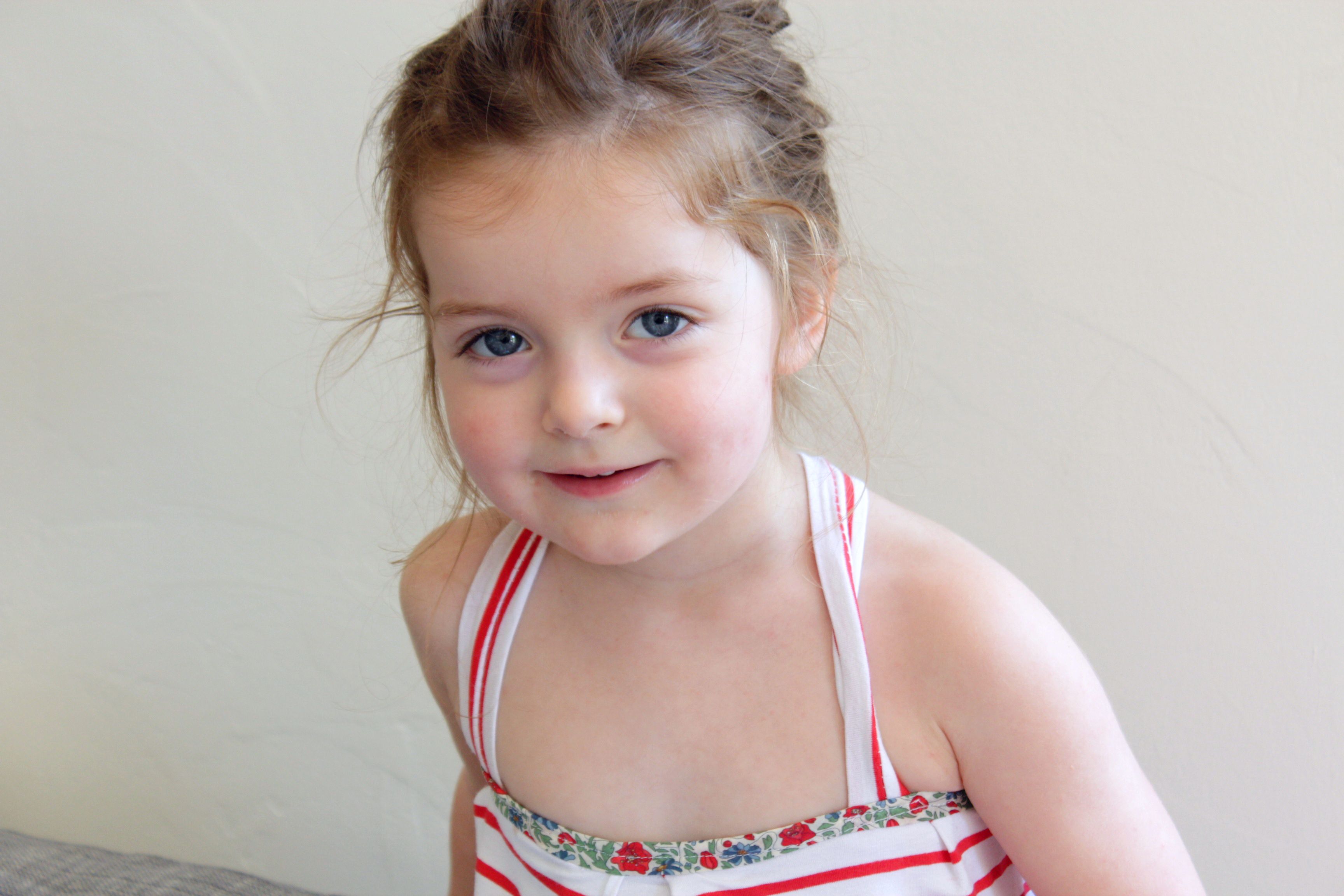 Hier soir je lui ai cousu une chemise de nuit. Je l’ai faite très très vite en m’apercevant au moment de la douche que tous ses pyjamas étaient bien trop chauds pour nos nuits caniculaires. Je me suis complètement gourée pour le sens des bretelles, j’ai foiré la pose du biais ( mais oui je foire le biais de temps en temps!). Elle n’a rien vu de tout ça, juste une longue chemise de nuit aérienne et légère pour aller faire de beaux rêves.