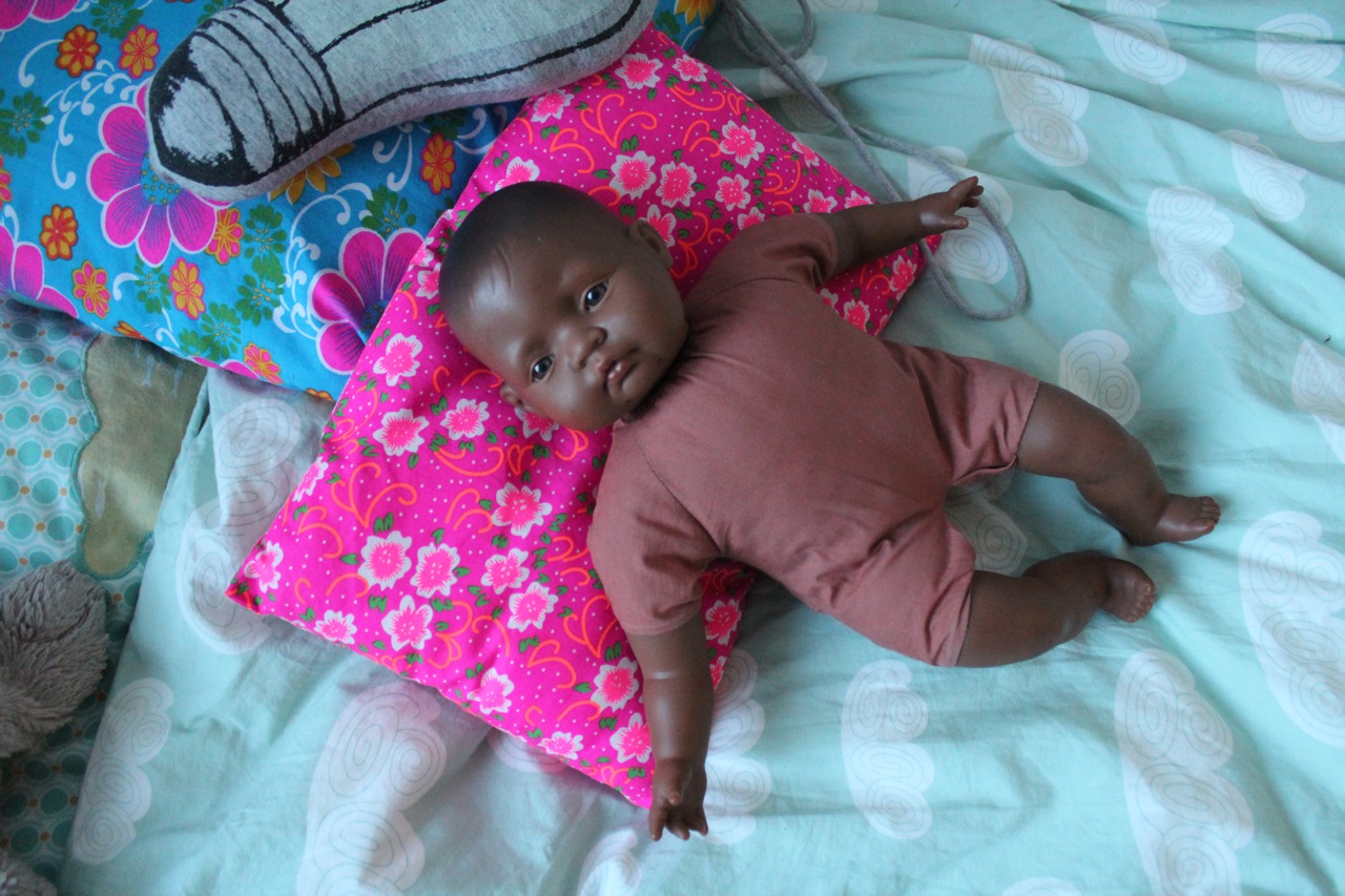 « Hop là bébé regarde on saute! Hé bébé, on va réparer le mur. Si tu es sage je te prete mon cheval sauteur. Oh mais non tu es trop fatigué, je te donne mon oreiller de fleur . »