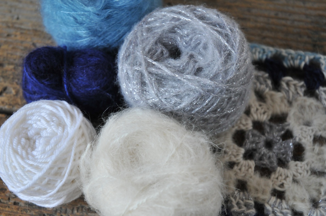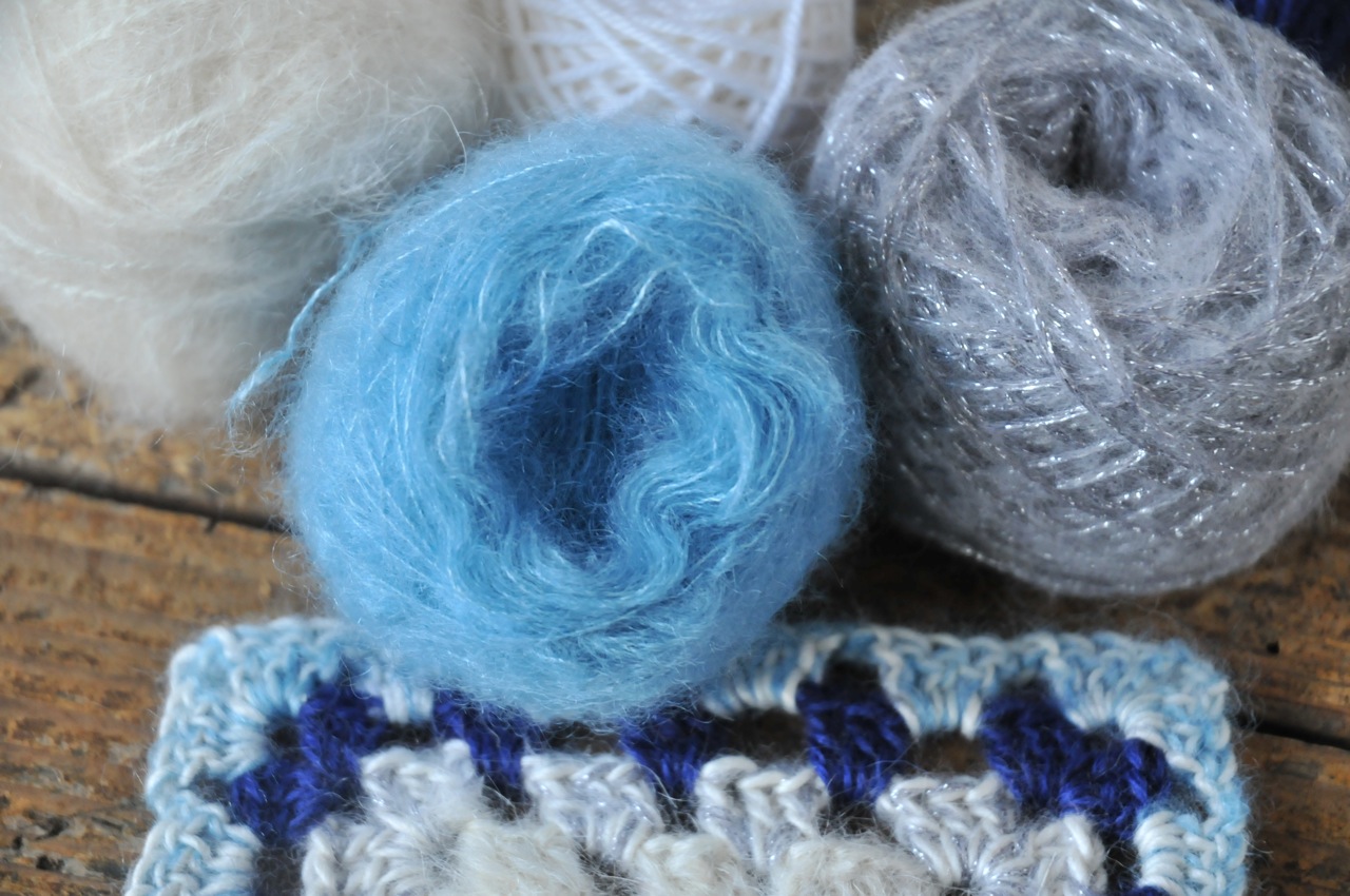 ❝ J’ai crocheté le mohair de ce tout petit col en pointe que je t’avais fait Violette, nous l’avons perdu il y a longtemps. Il était du bleu si beau de tes yeux. J’ai mélangé un autre ton de bleu avec un peu de plumette marine. J’en avais fait des mitaines avec un flocons argenté. Je les ai toujours, je viens de les retrouver dans un carton! Je continue aussi à mettre cette laine blanche si aérienne. bientôt il ne m’en restera plus…