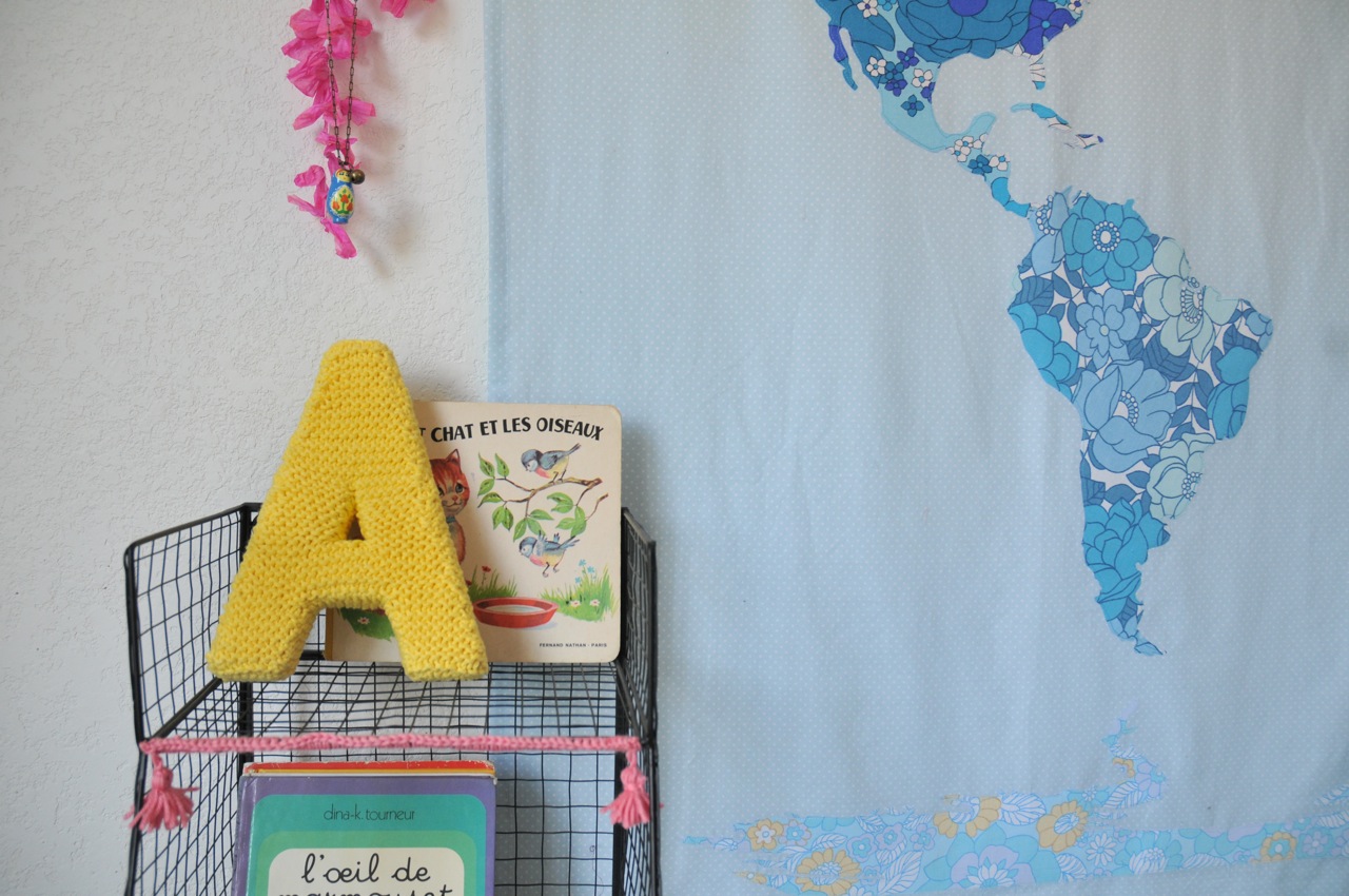 Il me reste encore pas mal de chose à faire quand même, papier peint, rideaux, tapis… Et puis vous le découvrez un peu ce soir avec ce A de laine, je suis en train de lui tricoter un abécédaire géant qui couvrira tout un pan de mur. Mais ça je vous en reparle bientôt car c’est un projet que je veux partager avec vous sous forme de tutos chaque mois.