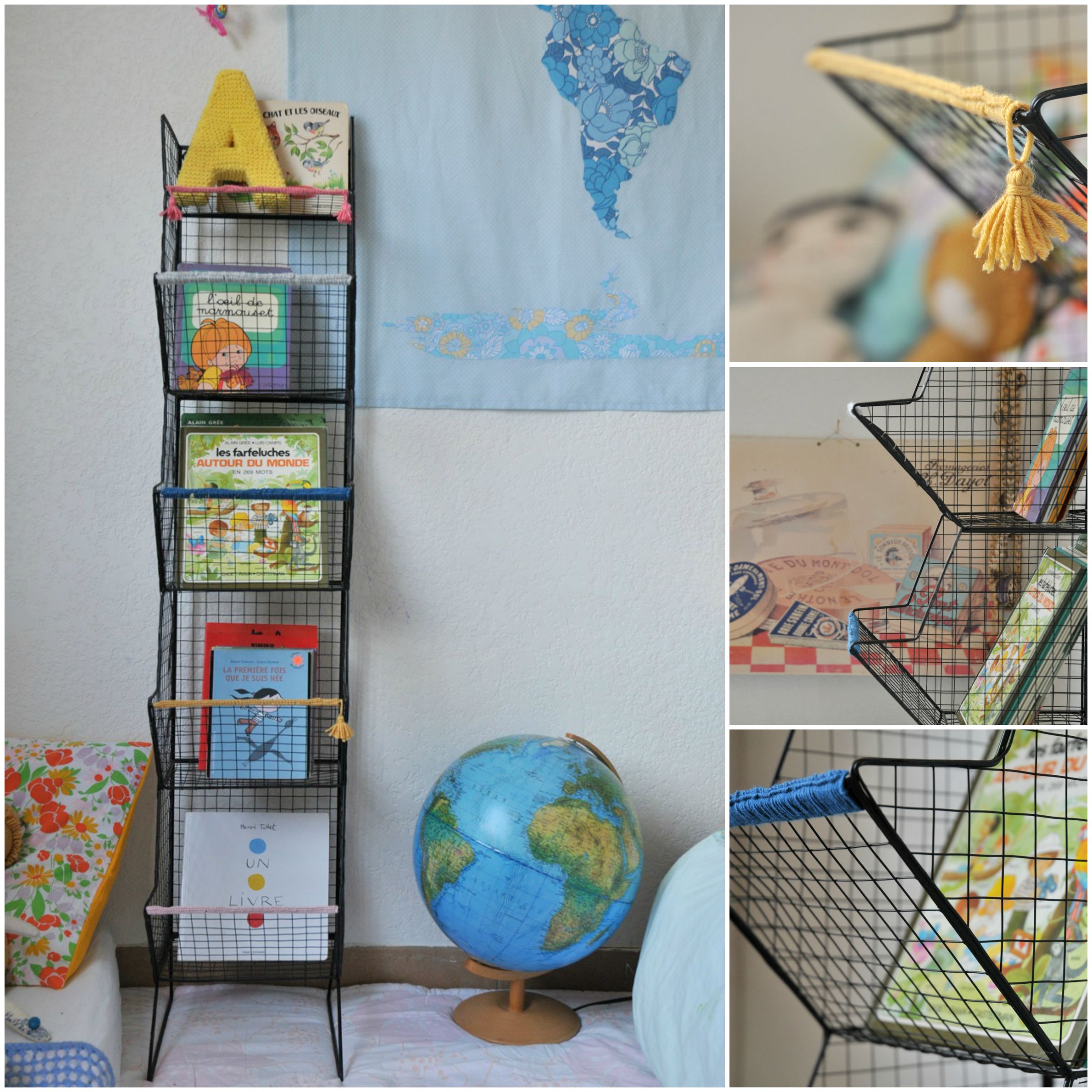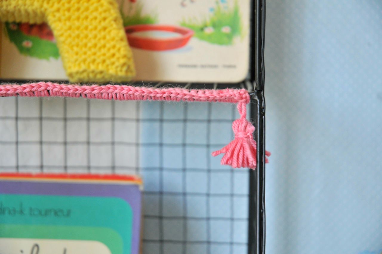 Je suis tombée sous le charme de ce meuble en le voyant dans la jolie chambre du fils d’Aude. Je cherchais une pièce un peu plus moderne pour contraster avec le buffet vintage. Il est parfait ! Bien entendu je n’ai pas pu le laisser à poil, j’ai eu envie de lui rajouter quelques mailles serrées au crochet et des pompons par ci par là. Tout cela est finalement très pratique, la petite sais où ranger ses livres ! Fastoche, les farfeluches c’est dans le bleu, les livres préférés dans le jaune. « C’est comme à l’école maman, c’est une très bonne idée tes trucs en laine ! » Merci ma chère !