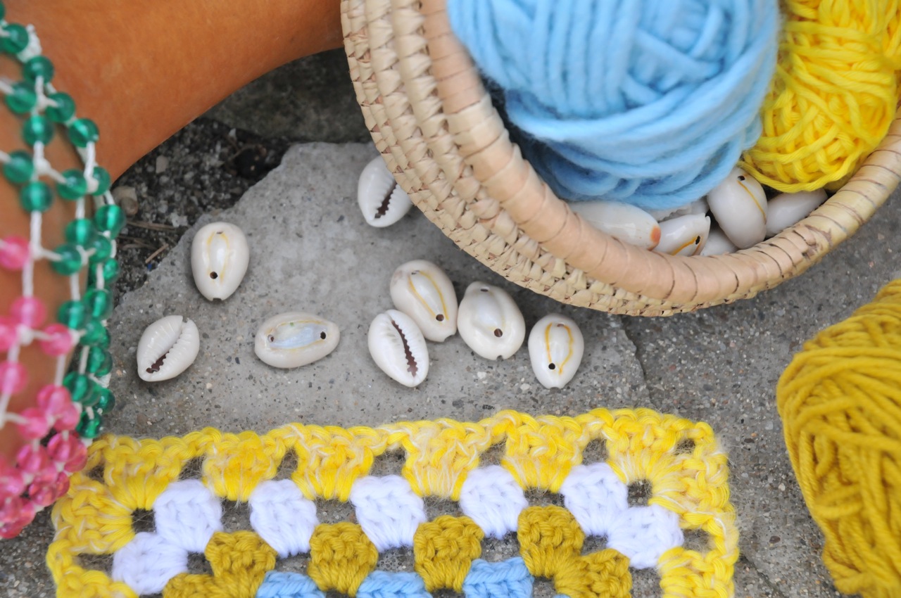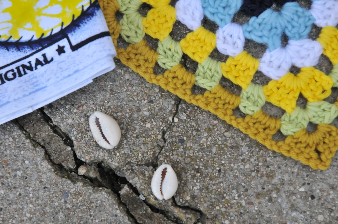 J’ai crocheté en essayant de me rapprocher des couleurs avec ce qu’il me restait d’une couverture de bébé Sacha, de cette laine bleue pâle dont ma grand mère lui avait tricoté un gilet et des chaussons. Il y a aussi ce moutarde bizarre qui s’apparente à un doré et dont je ne me souviens absolument pas…