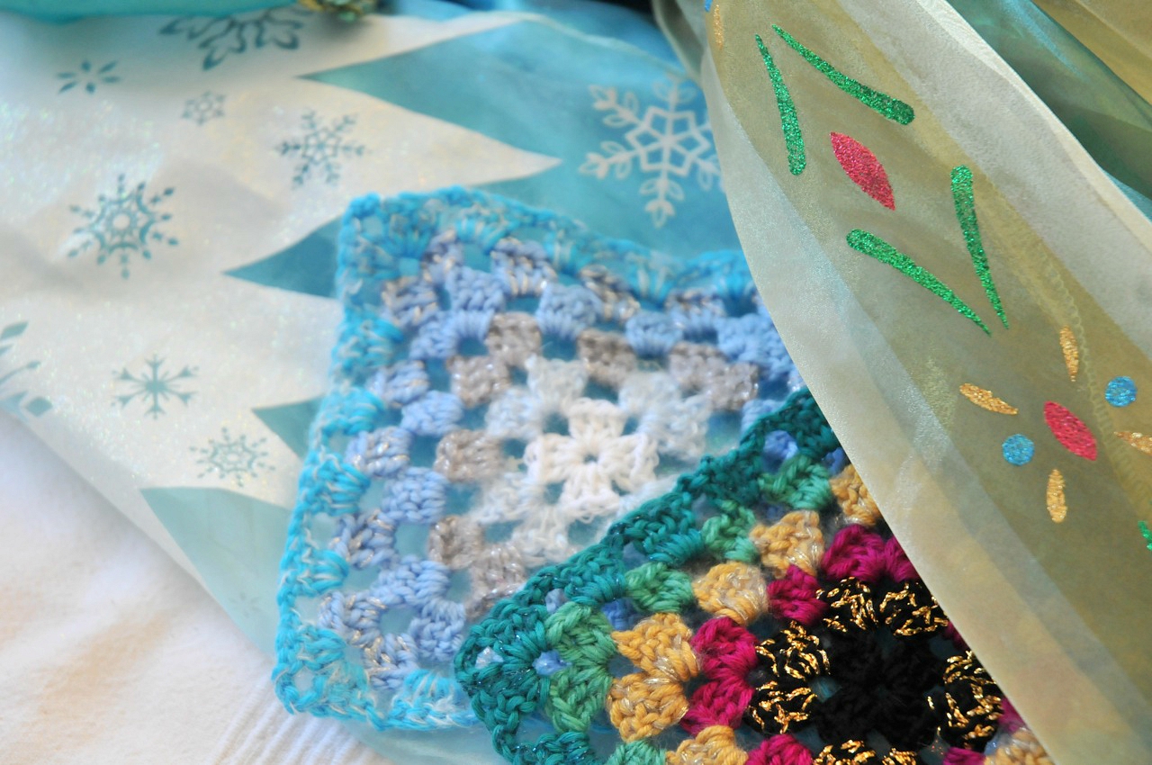 J’ai eu envie d’un clin d’oeil à cette semaine très girly en crochetant les deux carrés hebdomadaires de notre grande couverture aux couleurs d’Anna et d’Elsa. Je vous laisse imaginer la joie de la petite qui maille après maille découvrait les nuances de ses robes de déguisement.