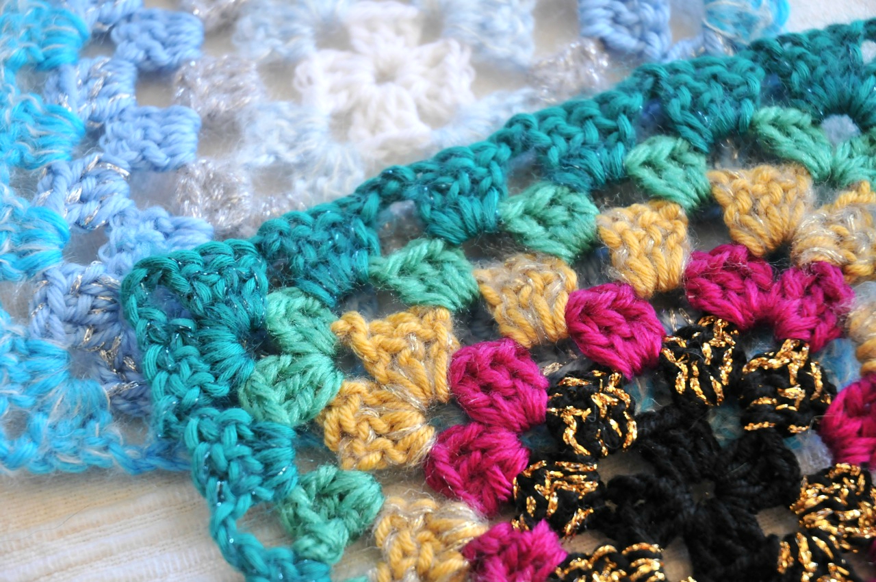 « J’ai utilisé les toutes fins de pelotes de ce lurex doré que j’ai depuis des lustres, les restes d’un châle de Noël de la maîtresse de Sacha, le fushia d’un personnage crocheté pour un boulot, ce bleu aérien du tout premier châle de Vio et même cette plumette dont j’avais chiné un pull couleur brocoli!.