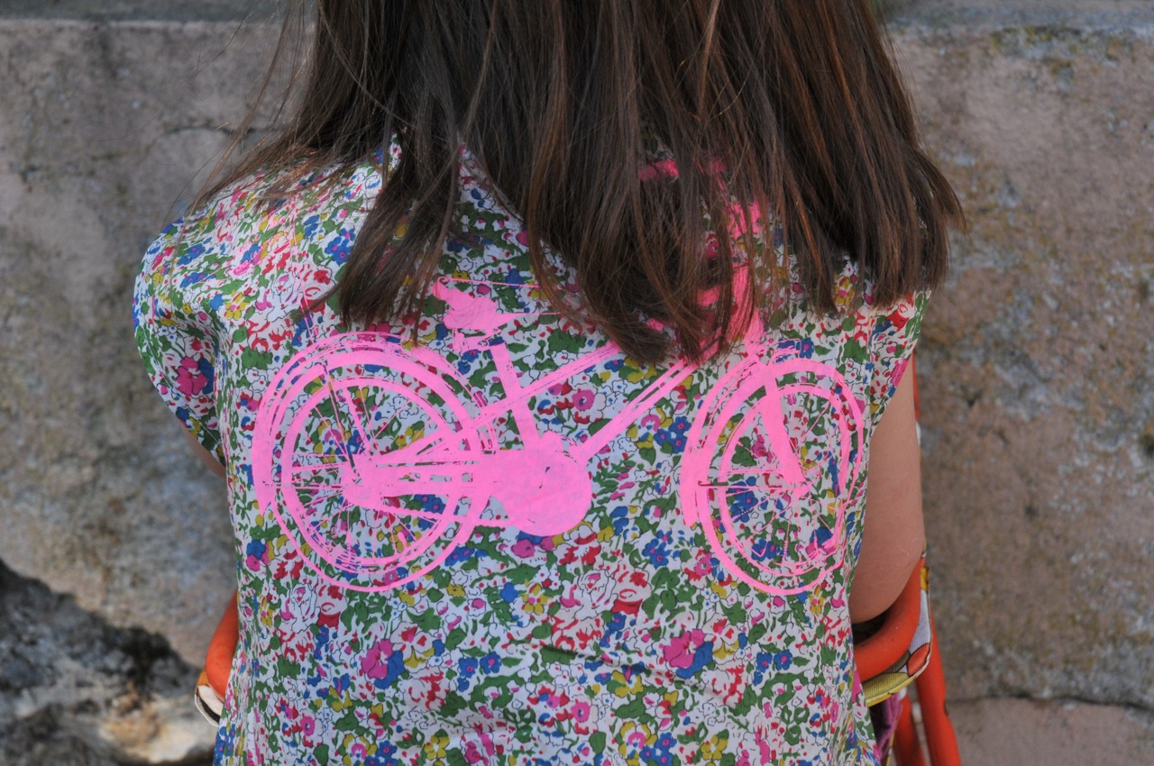 J’ai gardé l’encolure et le boutonnage du devant. Je suis partie de mon patron fétiche du moment, le tee shirt Trop Top d’Ivanne S et j’ai rajouté toute la partie basse de la liquette en gardant l’arrondi pour terminer la robe. Un petit biais pour finir le dos et voilà une robe pile à la bonne taille et légère comme une plume, parfaite pour l’école et les journées chaudes d’ici.