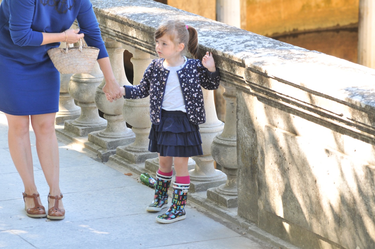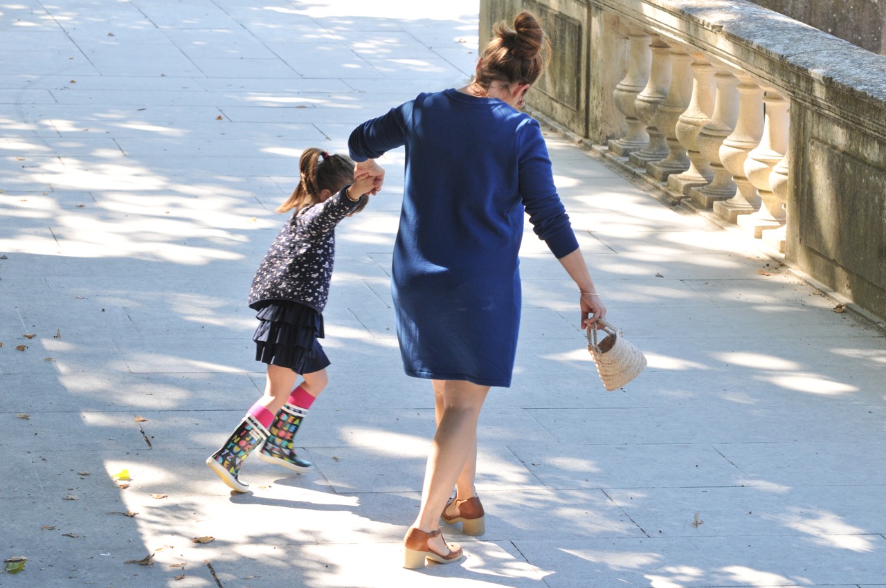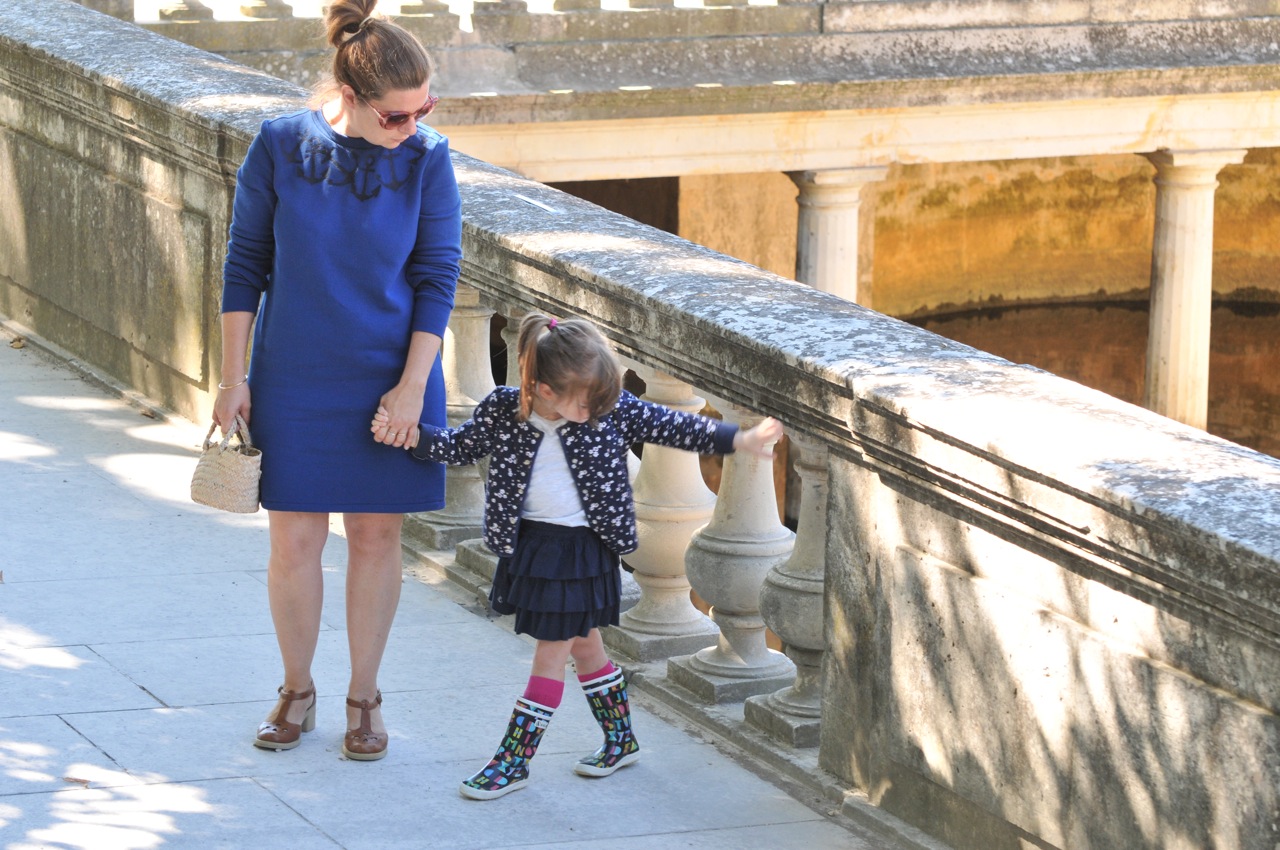 Nous portons toutes les deux des tenues Petit Bateau, des chaussures Asos pour moi et des bottes Aigle et des chaussettes hautes Collégien pour Vio. Mes lunettes ont été chinées et le soleil derrière c’est cadeau !