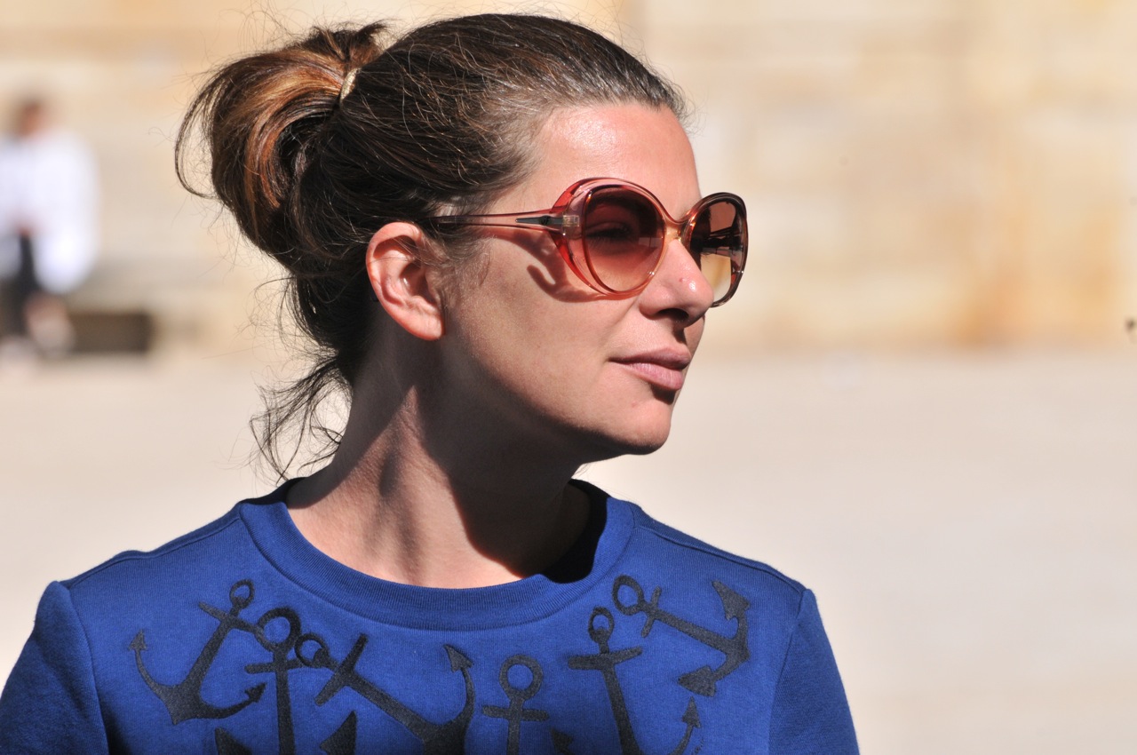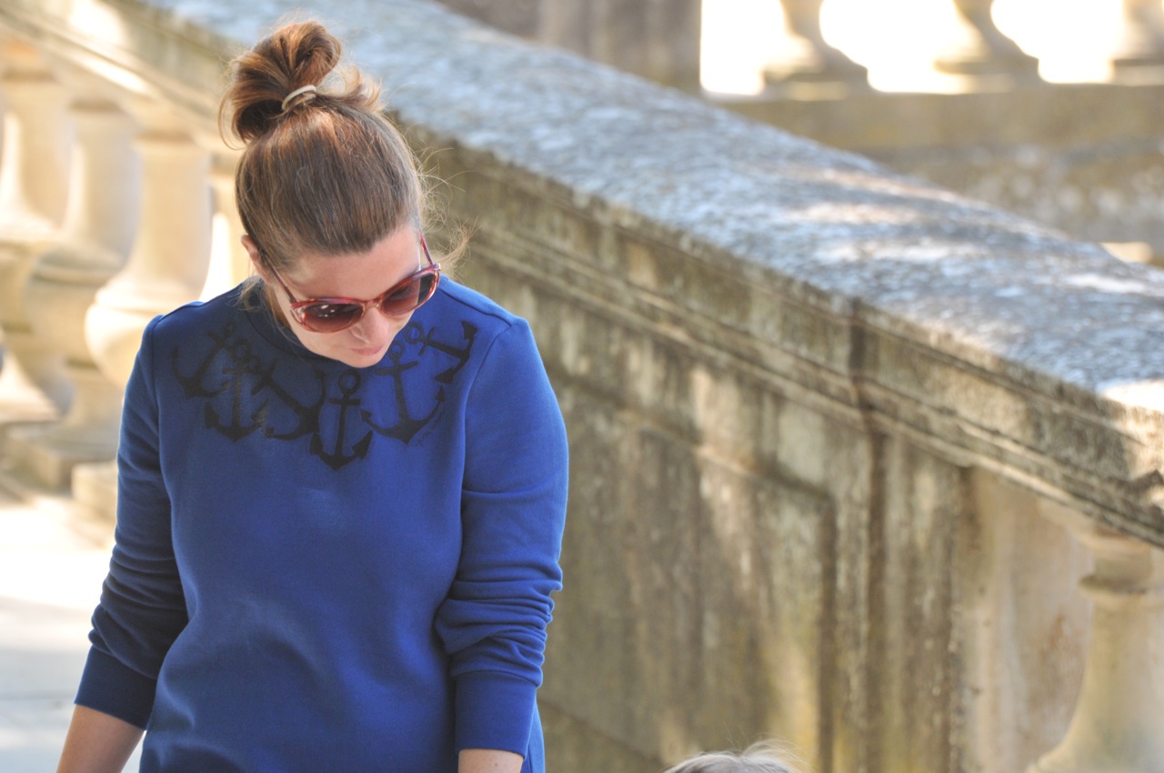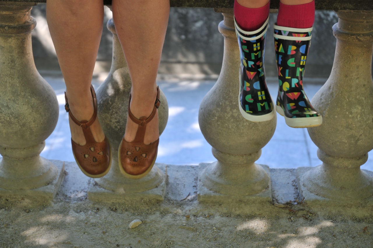 Nous portons toutes les deux des tenues Petit Bateau, des chaussures Asos pour moi et des bottes Aigle et des chaussettes hautes Collégien pour Vio. Mes lunettes ont été chinées et le soleil derrière c’est cadeau !