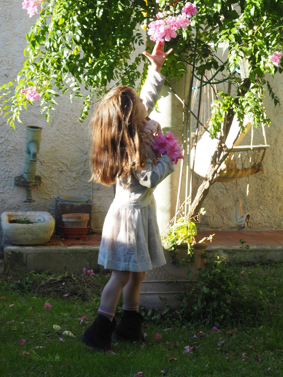 Dans le jardin D’Ati en revanche c’est un paradis pour Violette. La bignone explose, les roses délicates sont à portée de main, Il y a les iris et le mimosa à la fin de l’hiver et le trèfle qui envahit tout.