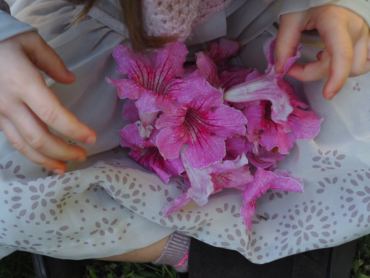 Dans notre jardin il y a peu de fleurs. Il y a bien les pissenlits qui poussent à tout va dans l’herbe, les quelques marguerites que nous avons plantées et les bulbes aux printemps. Plusieurs roses à nos rosiers mais notre colline aride ne nous permet pas d’avoir une multitude de variétés.