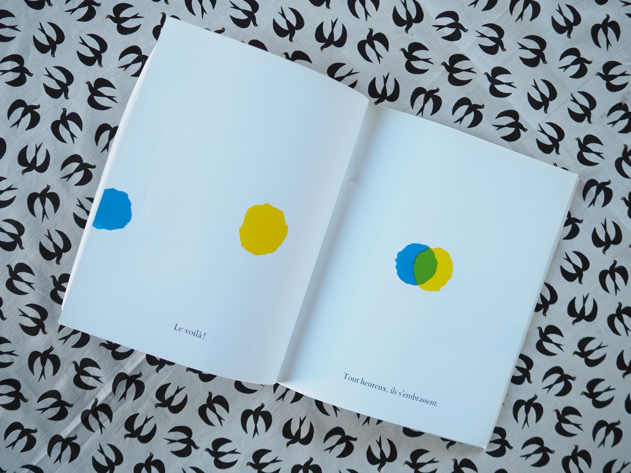 Deux couleurs qui se mélangent pour en donner une troisième, voilà un peu notre histoire à nous aussi. Cet album est une pure poésie, son message est aussi fort que ses illustrations sont simples. Ce livre m’a aidé à parler de différence, de tolérance, de racisme aussi. C’est un livre qui mine de rien a semé dans nos coeur des graines qui je l’espère porteront de beaux fruits plus tard.