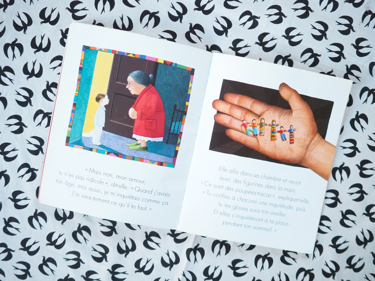 Que dire de ce bijou? À part que lui aussi nous a beaucoup aidé… J’avais ramené du Vénézuela des toutes petites poupées tracas comme dans ce livre, je les avait mises dans un sac en madras rouge sous l’oreiller de mon petit. Nous avons lu et relu cette histoire de poupées qui s’occupaient à la place des enfants de tous leurs soucis. Sacha a mieux dormi. J’aime à penser que ce livre a des pouvoirs magiques. Et puis c’est évidemment lui qui m’a poussé à fabriquer des poupées tracas pour d’autres enfants. Je suis très attachée à ce livre résilient, et je crois que mes enfants aussi.