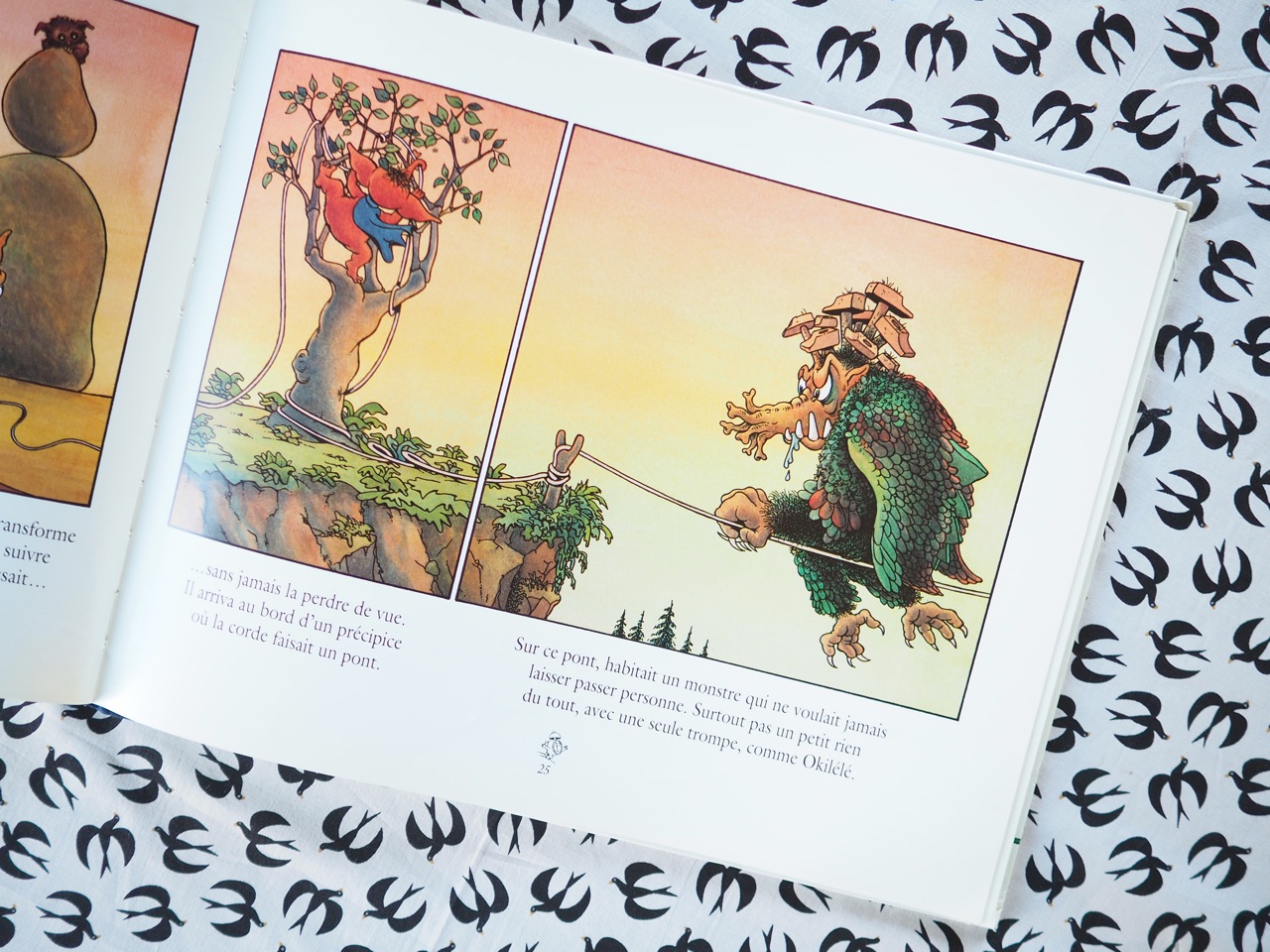 La première fois que Sacha a entendu cette histoire, nous étions en Vendée chez Tatie A. Je dois avoir une photo de son fils, elle et le mien, blottie dans un lit avec ce livre. C’est elle qui m’ a fait découvrir cet auteur. Claude Ponti est un extraterrestre de la littérature jeunesse, soit on aime à la folie, soit on déteste. Et je pense qu’il en est de même avec les enfants. Ici c’est au delà d’aimer, un monde sans Ponti serait carrément moins drôle, moins effrayant, moins inventif. J’ai buté sur ses mots, nous avons ri sur ses monde farfelus, j’ai eu la gorge nouée sur certains albums, tant il y a de lectures possibles. Nous lisons Okilélé depuis la plus tendre enfance des enfants, et je suis intimement persuadée que les monstres, la poésie, la dureté parfois de ce livre ont armé mes petits pour la vraie vie. « Les monstres ça n’existe pas maman, sauf dans les livres de Ponti, là ils sont vraiment affreux ».