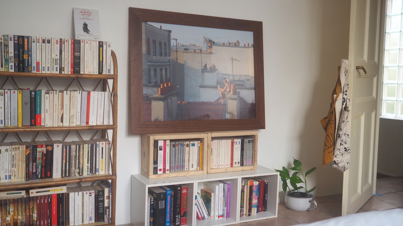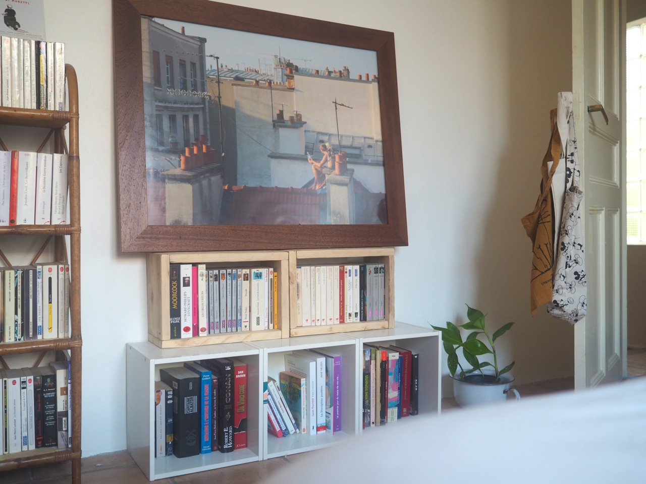 Nous avions un cadre en bois que j’aime beaucoup et nous avons décidé de simplement le poser sur nos livres. Cette photo, je l’ai prise juste avant notre départ de Paris, aux tous premiers jours de Juillet, je vous l’avais montrée il y a un mois d’ailleurs, elle illustrait les quelques lignes que j’avais écrites sur Paris.