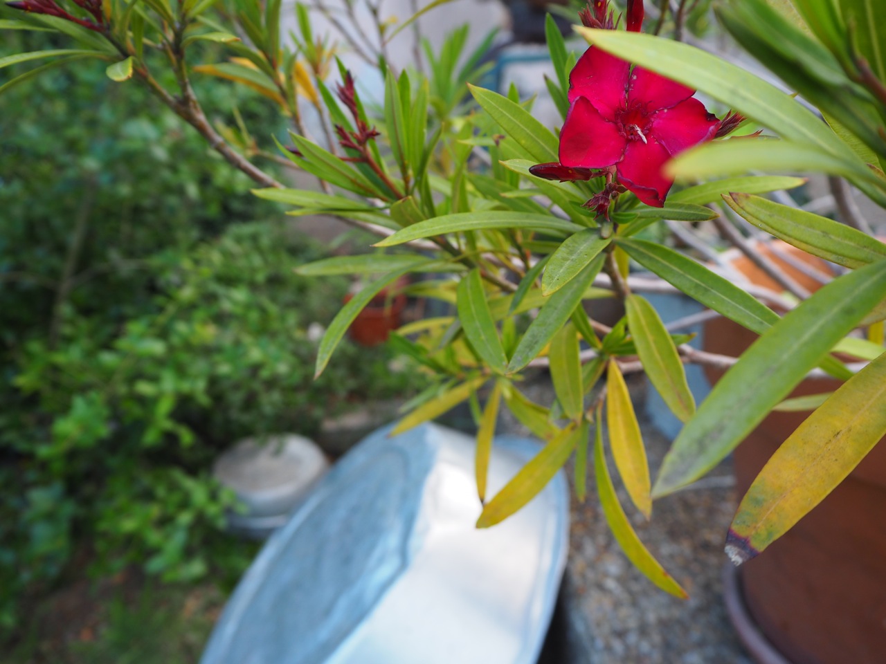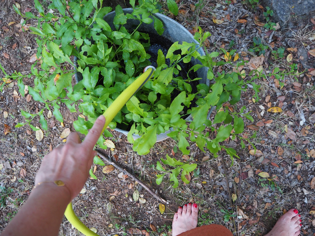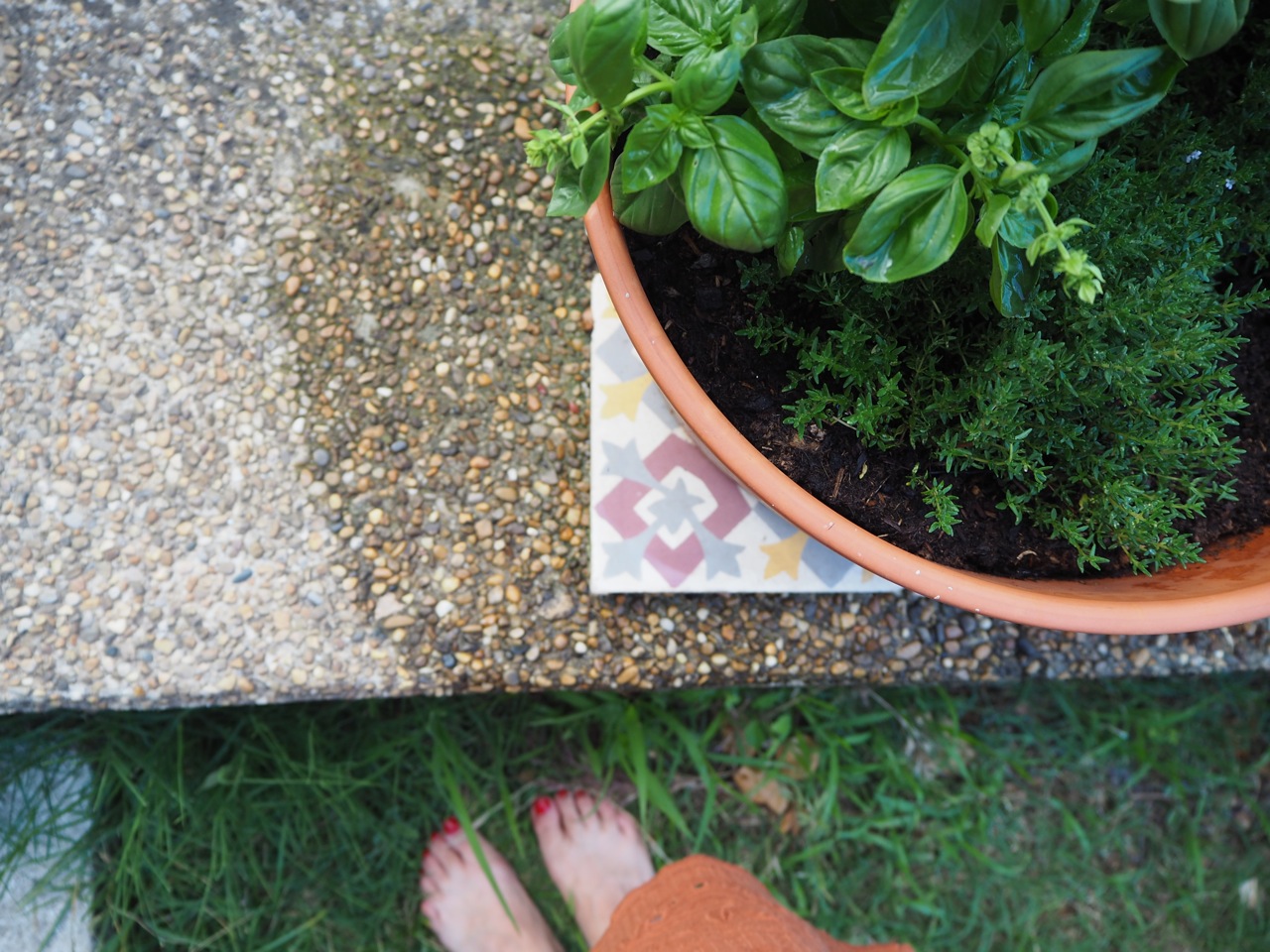 La terrasse un peu rugueuse et la citerne transformée en piscine. L’herbe folle qui n’est pas du gazon mais si fière qu’elle se prend comme telle. Les pots fendillés, les olives qui tombent…