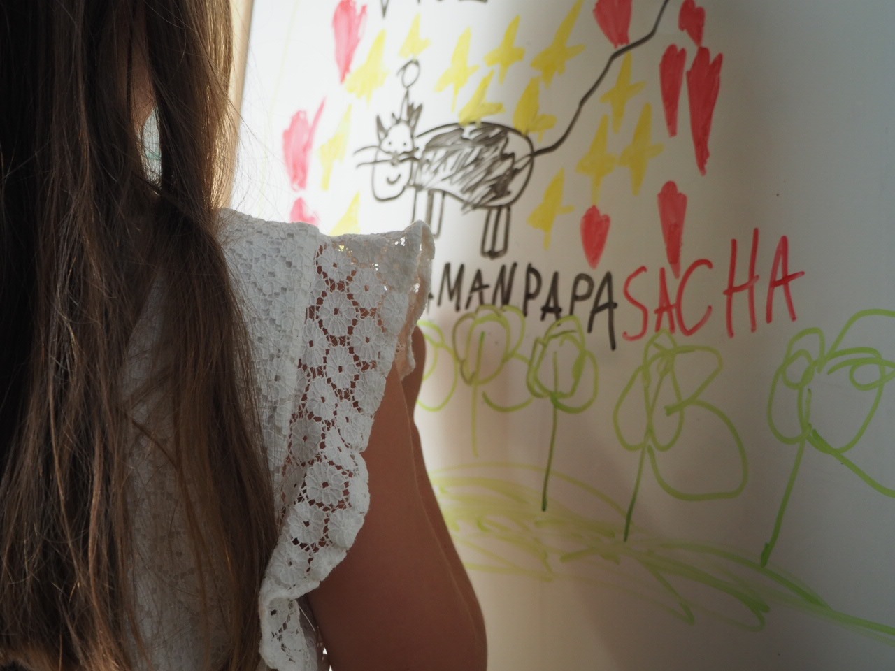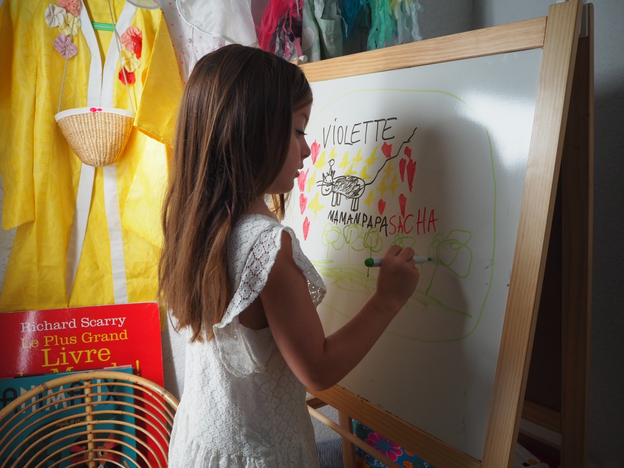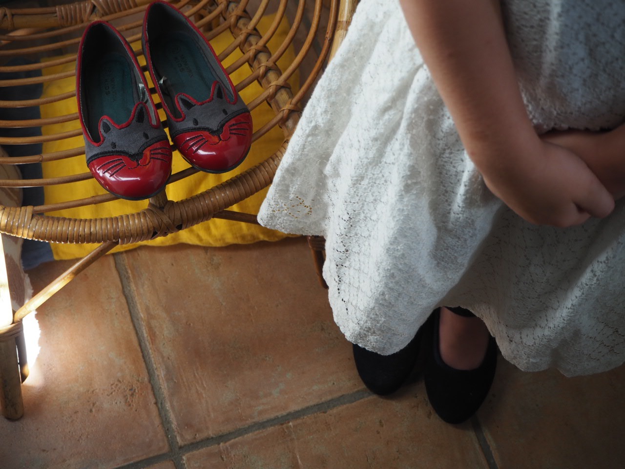 Violette porte une robe en dentelle et des ballerines (Chat et velours marine) de la nouvelle collection Monoprix. Toujours du joli là bas, flâner dans les rayons ou sur le site avec la petite, l’écouter devenir une petite jeune fille est toujours un joli moment. Impossible de choisir entre ces deux paires, cette enfant a une totale addiction aux ballerines. Je n’en porte pourtant jamais, je ne sais pas d’où elle tient cette lubie ! Ce qu’elle tient de moi en revanche c’est cette certitude que chaussée de petites beautés, on peut croquer le monde tout cru !