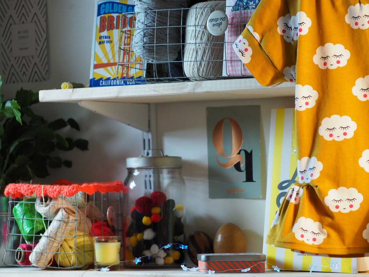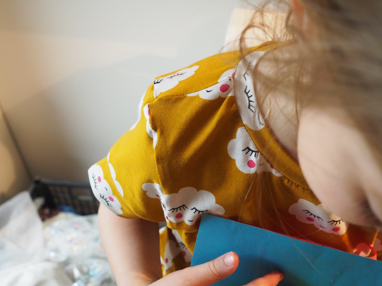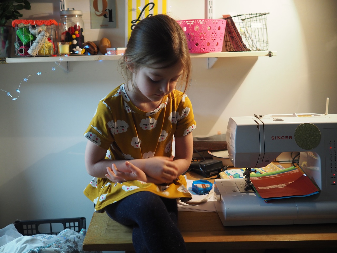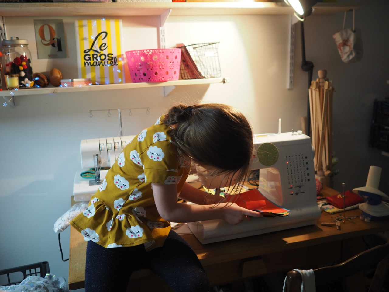 Nous avons fait quelques photos avec Violette qui adore littéralement ma cousette pour elle, dans le désordre d’un atelier qui ferme ses portes pour la soirée, avec du fil et des bouts de tissus par terre.