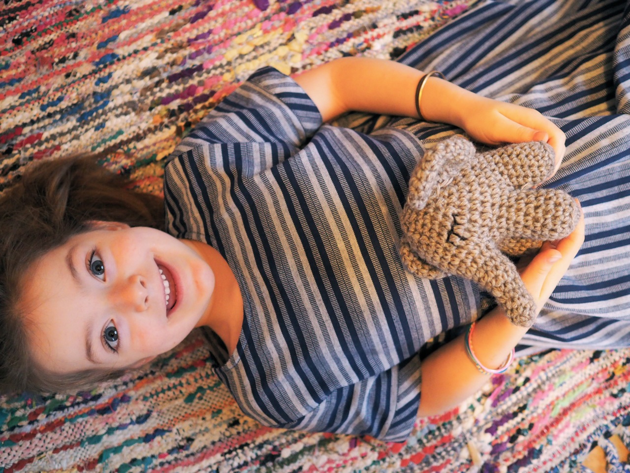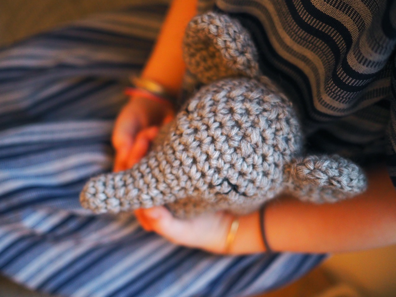 Un éléphant et quelques mailles serrées. Le sourire de ma Violette une fois les fils rentrés et le doudou dans ses bras. Ses yeux grands ouverts quand je lui ai dit que oui, bien sûr, il était pour elle…