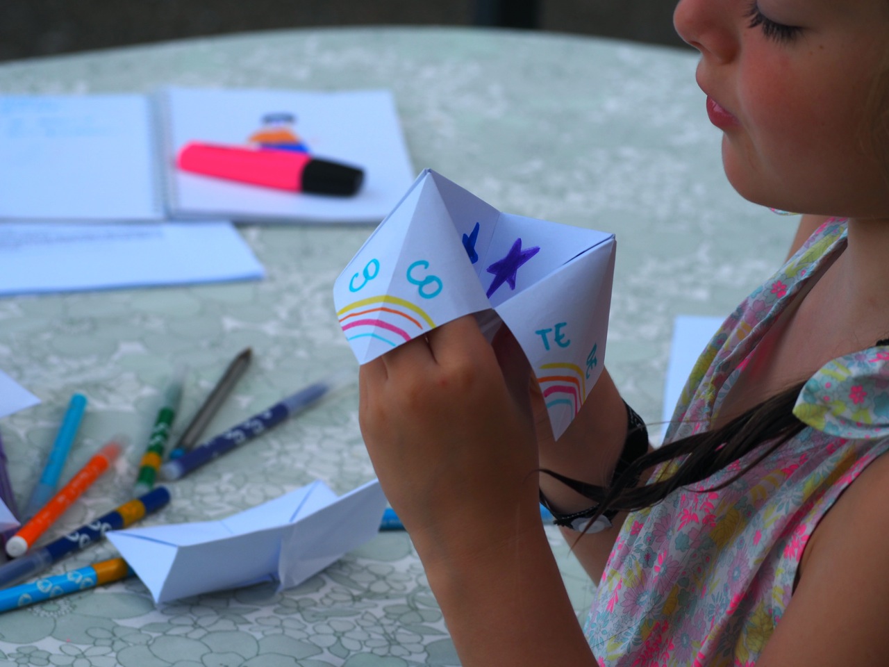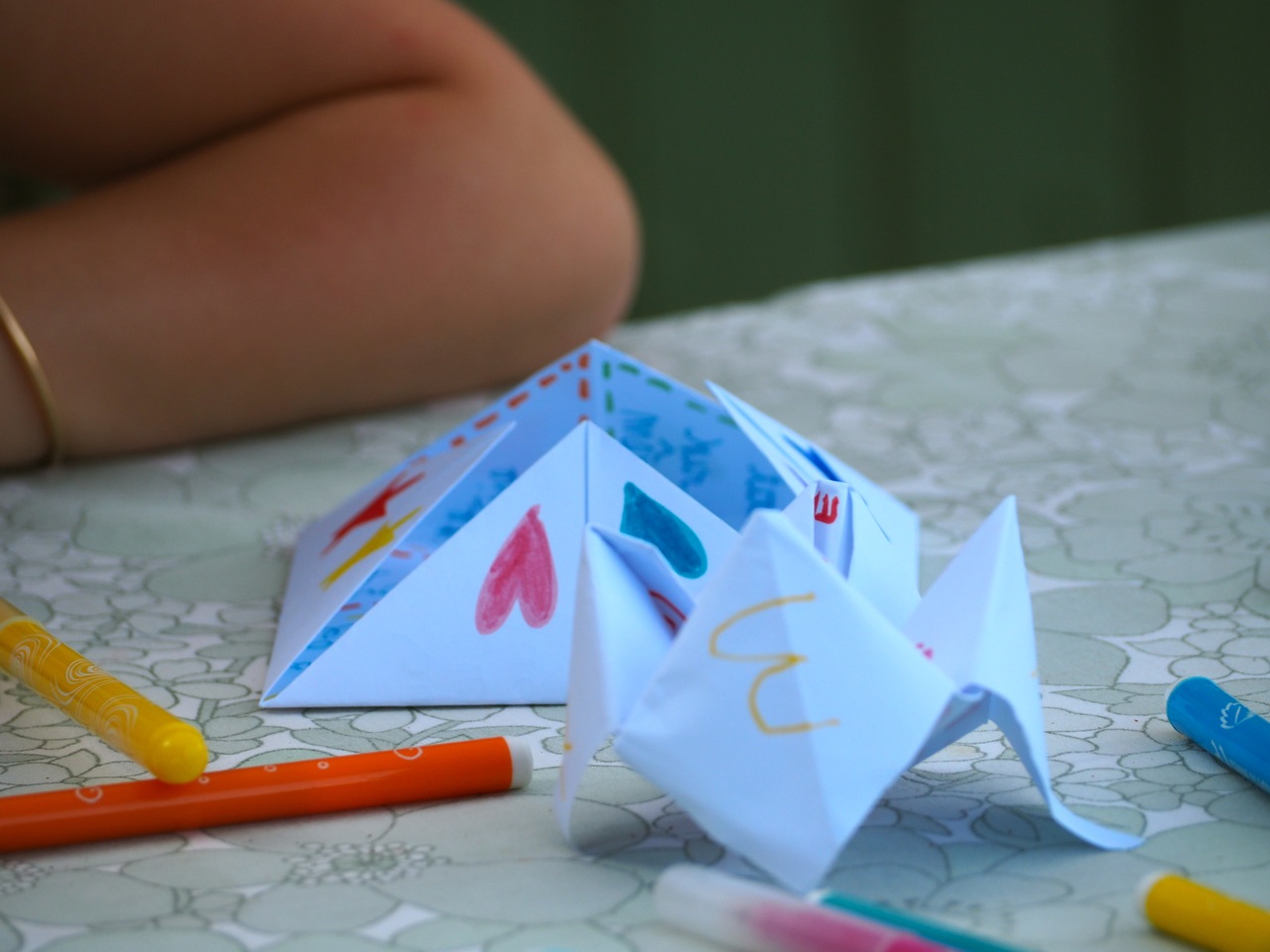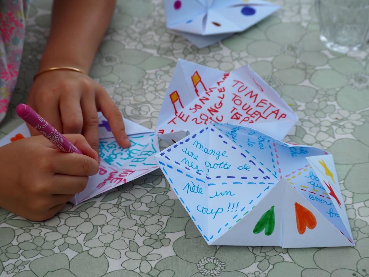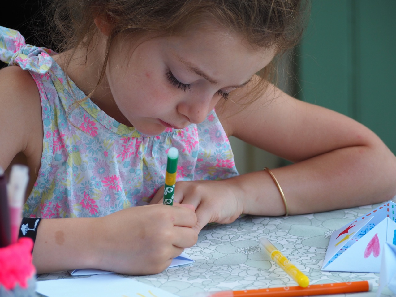 J’aime tant la voir qui s’applique. Elle choisit les couleurs comme si cela avait une importance capitale. Ça sent la fin de l’école et la natte mouillée d’un saut dans la piscine. Ça sent bon l’enfance dans un carré de papier plié, du feutre plein les doigts et l’espoir de faire rire les copines à l’école.