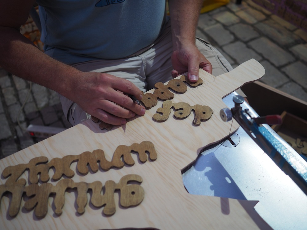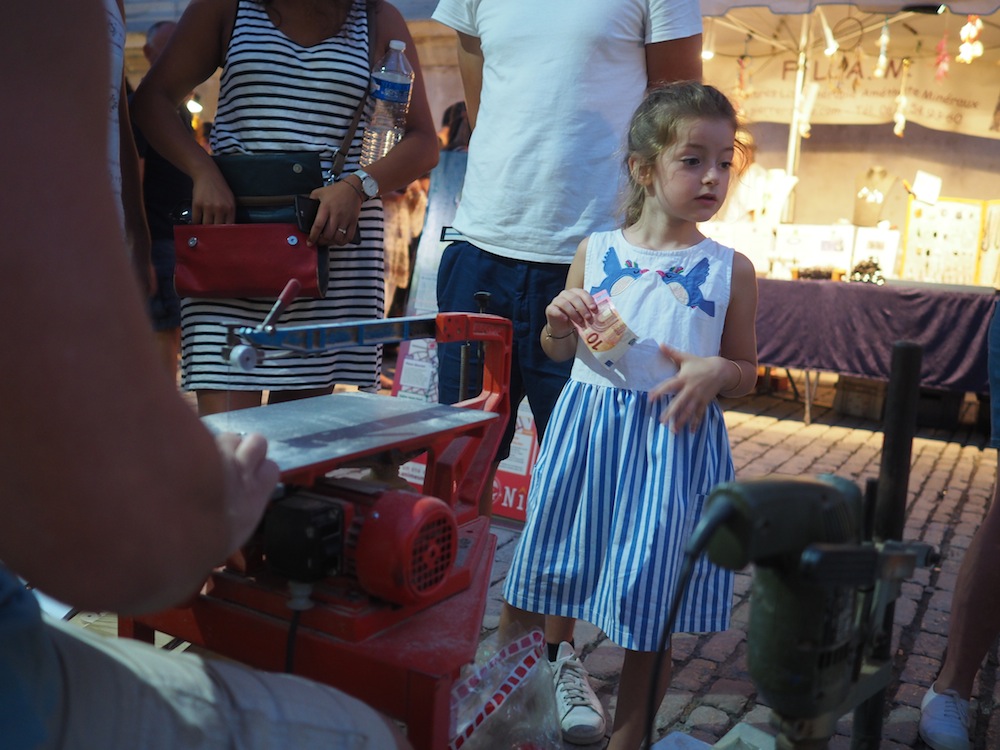 Jeudi dernier, comme chaque jeudi ou presque de notre été, nous avons déambulé dans notre belle Nîmes. Elle avait repéré en Juillet un monsieur qui faisait des prénoms en lettres de bois et c’est ça qu’elle voulait. Pas de bracelets, pas de poupée ni de magasine de princesse. Non juste juste un petit morceau de basalm et huit lettre de bois toutes rondes.