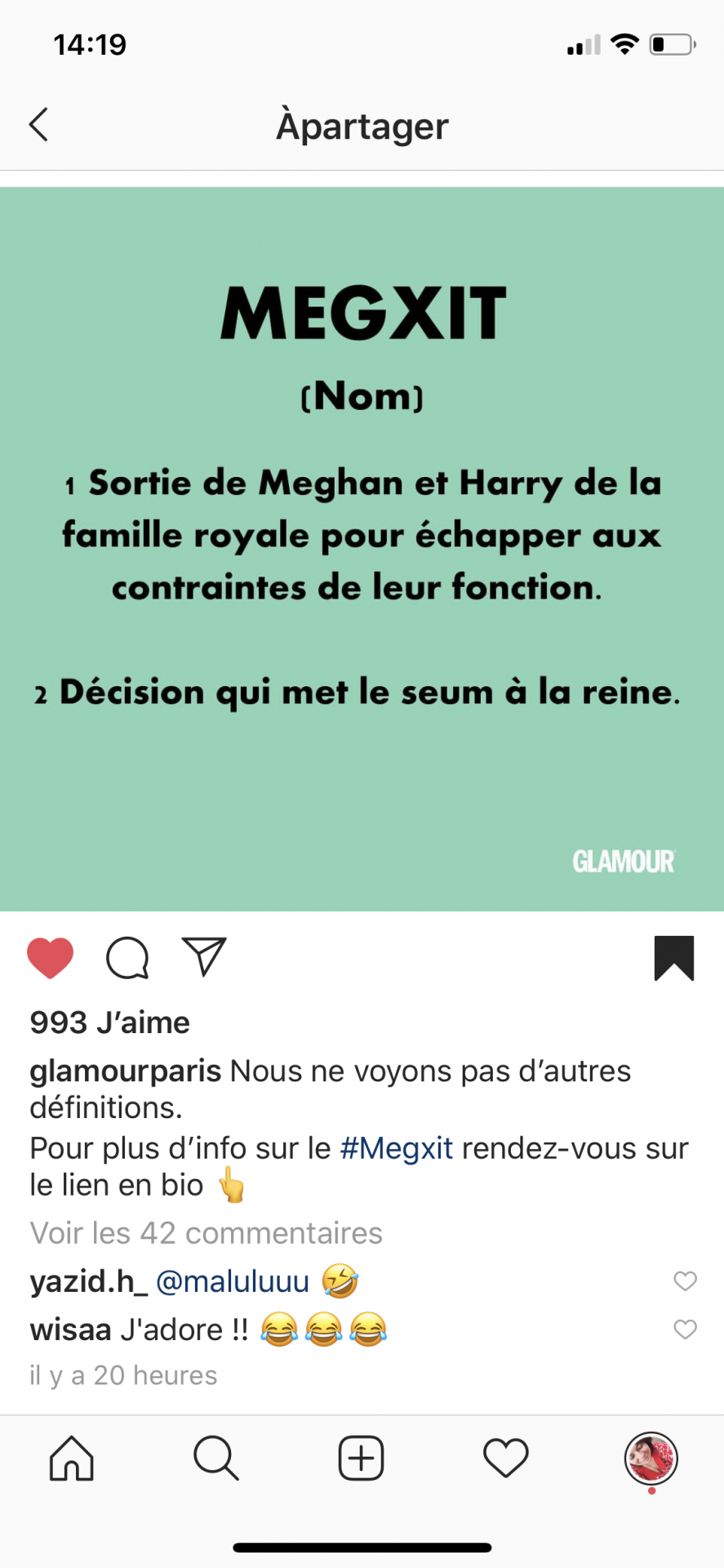 J’ai ri avec cette publi Glamour (Bien sur que non, je ne suisPAS DU TOUT abonnée à l’insta de Glamour, il s’agit d’un push instagram BIEN EVIDEMMENT!) En grande passionnée de la Windsor Family je ne pouvais pas passer à côté de l’info cruciale de ces derniers jours. Meghan fout tout en l’air voilà!! (En vrai je trouve ça vraiment chouette que ces deux là insufflent un peu de modernité à la couronne. Mais pour l’heure assez de Stéphane Bern en moi pour Aujourd’hui) (Titre)(au mon dieu je ne sais pas si je l’assume celui là.)