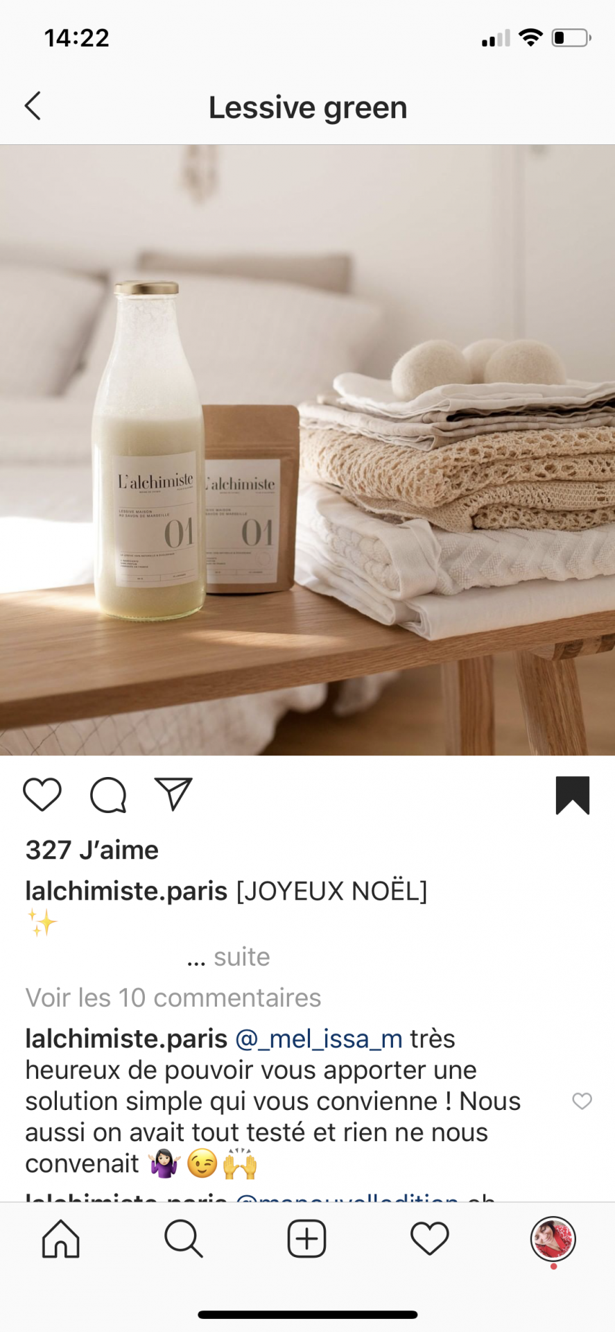J’ai apprécié l’univers de l’@lalchimiste.paris qui propose entre autre et comme le visuel ne l’indique pas une lessive en poudre dans un contenant réutilisable en verre. Leur crédo : Nous croyons à l’alchimie entre peu d’ingrédients naturels et aux recettes de grands mères.